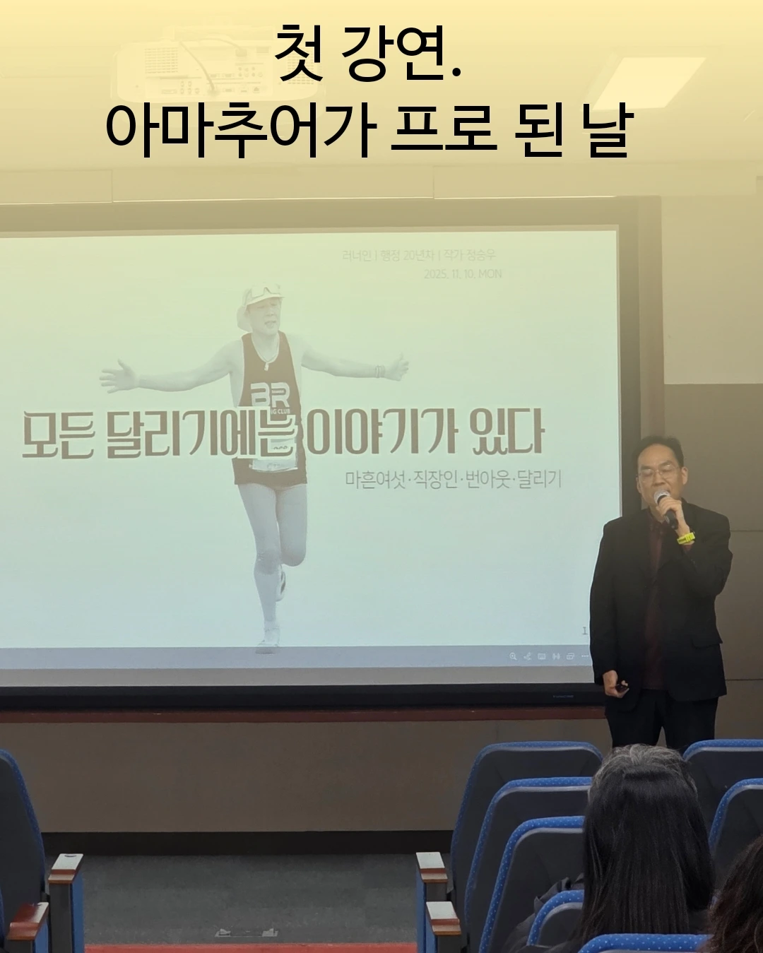 공무원 대상 강의 인트로에 이 이야기를 넣었다. "누군가 그러더군요. 공무원 분들 대상 강의는 반응도 없고 표정도 없고 호응도 없을 거라고요. 그래도 괜찮습니다. 제가 달리기 전 세상에서 가장 영혼이 없이 살던 사람이었거든요." 아예 대상을 정조준하면서 시선을 끌며 정면 돌파했다.