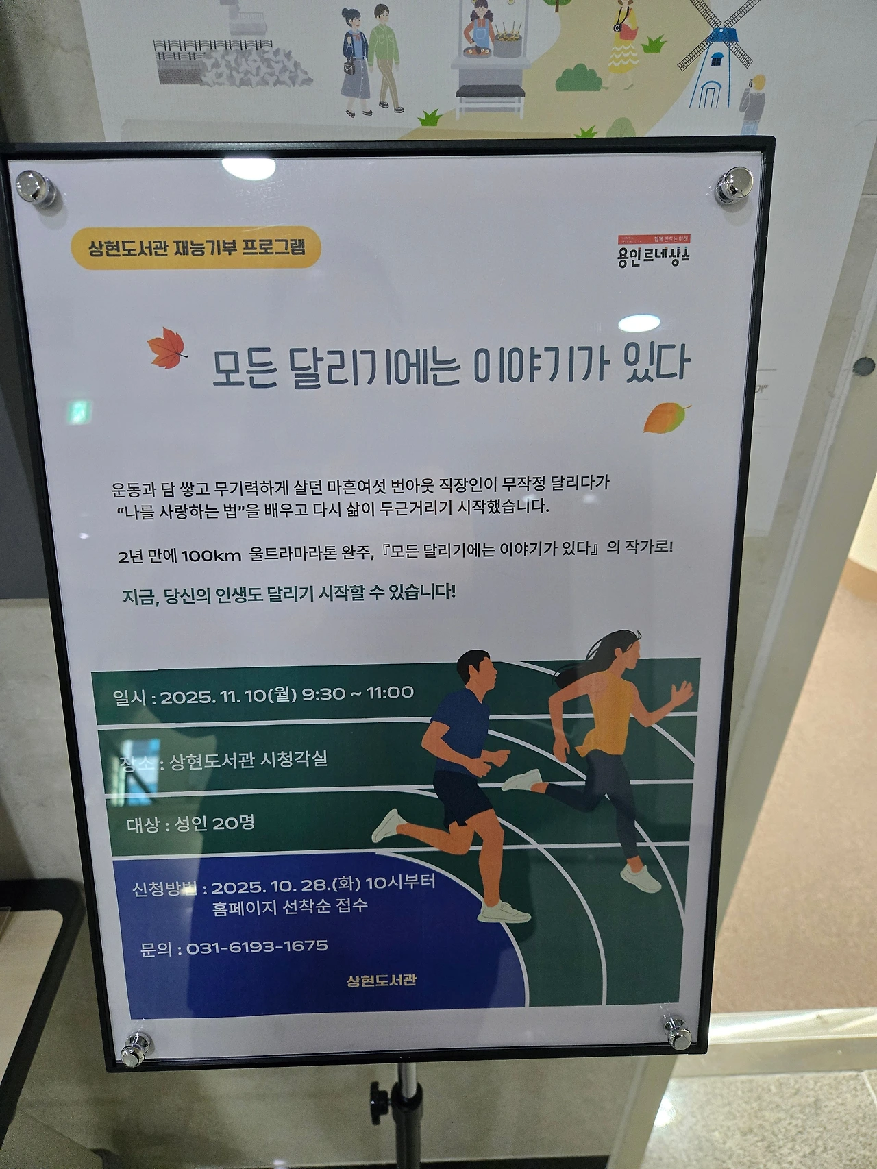 새로운 도전의 첫날이다. 강연자로 무대에 선 첫날. 아마추어와 프로, 두 개의 강연이 하루에 잡혔다. 1차로 도서관에서 오전 9시 반부터 11시까지 1시간 30분간 재능기부 강연을 진행하고, 2차로 자리를 옮겨서 오후 1시부터 3시까지 경기도인재개발원에서 러닝 인문학 강연을 진행했다.