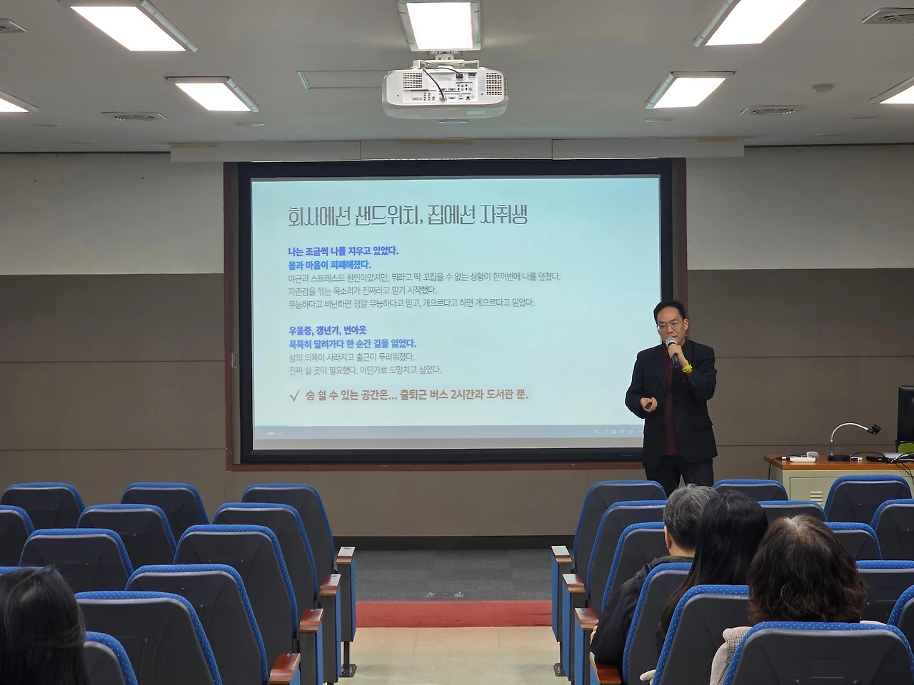 오전, 시민 대상 도서관 강의 인트로는 언젠가 들었던 어느 작가님 강연 이야기로 시작하기로 했다. 가족의 사랑으로 위기를 넘겼다는 훈훈한 이야기였지만, 그때 나에게는 답을 주지 못했다. 그 이야기를 넣었다. "어느 작가님 강연을 들었습니다. 가장 힘든 시기를 가족의 응원과 지지로 이겨냈다는 이야기였죠. 저는 의문이 생겼습니다. 만약 그때, 가족조차 위로가 되지 않았다면 그 시기를 어떻게 이겨내셨을까요? 그 질문의 답을 오늘 제 이야기로 전하려고 합니다."