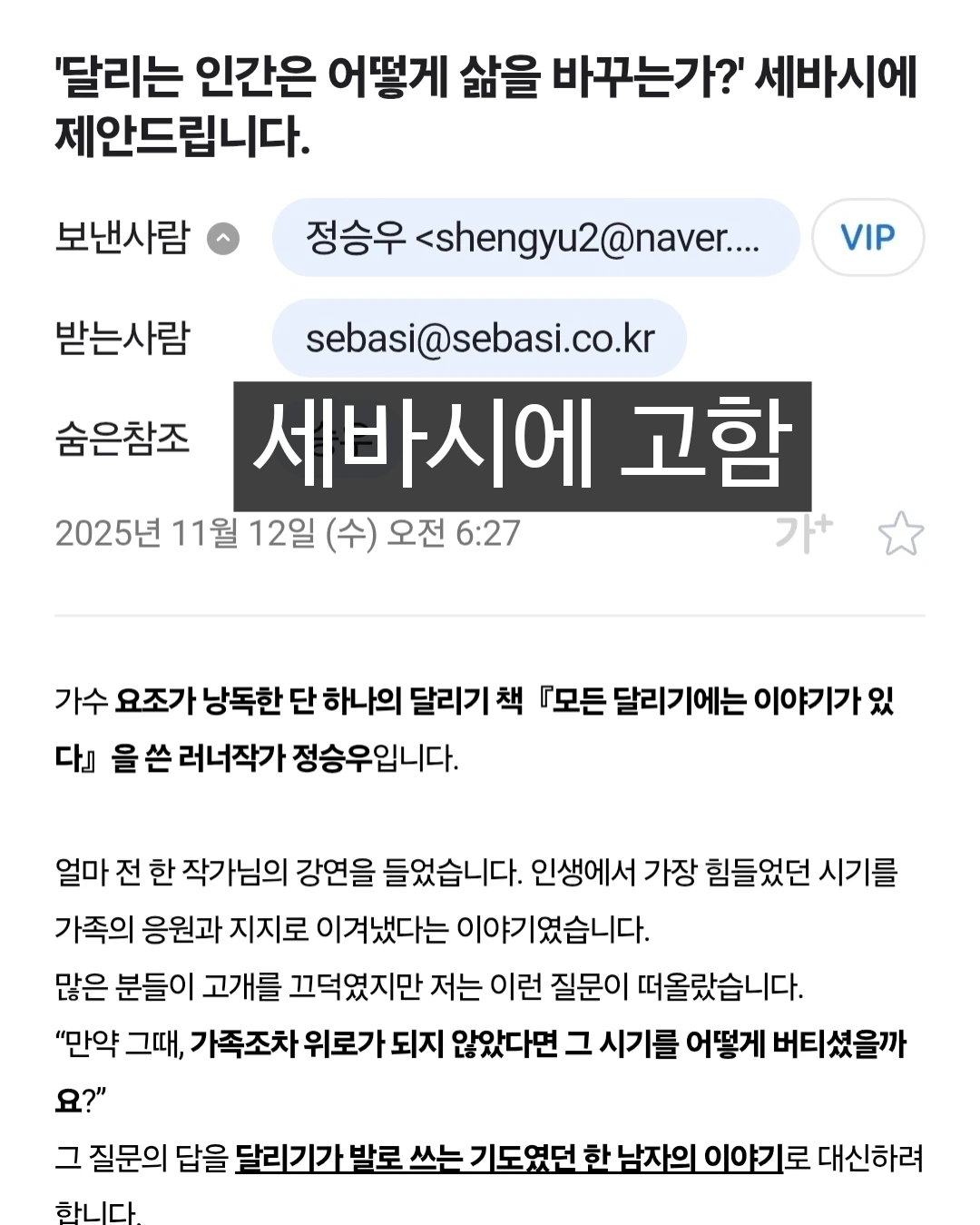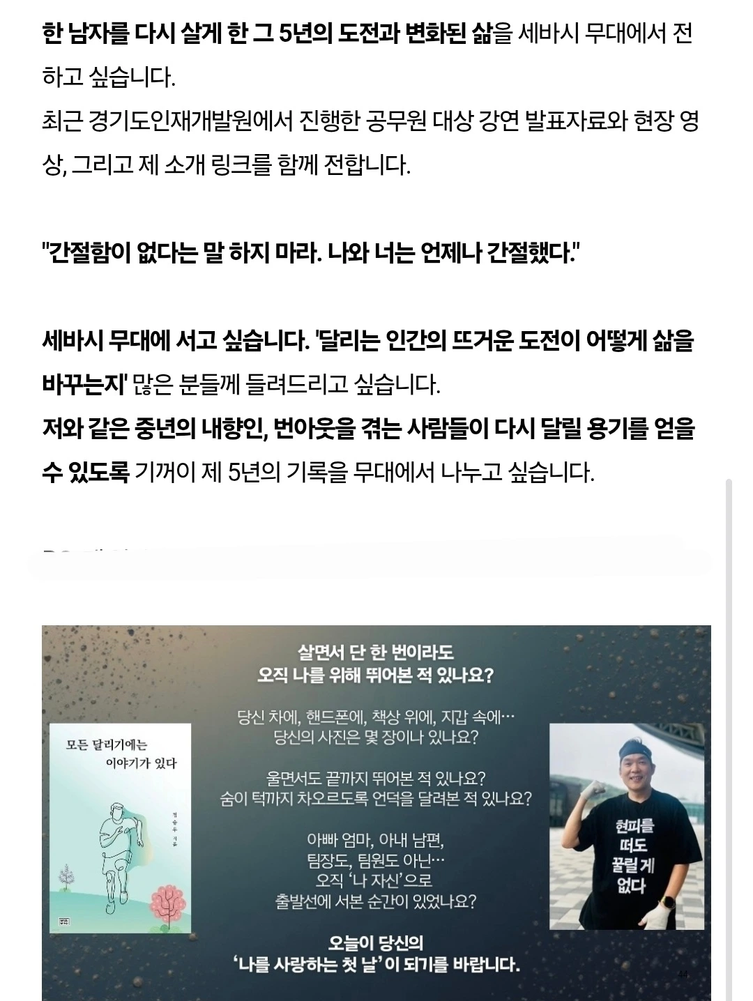 세바시 무대에 서고 싶습니다. '달리는 인간의 뜨거운 도전이 어떻게 삶을 바꾸는지' 많은 분들께 들려드리고 싶습니다. 저와 같은 중년의 내향인, 번아웃을 겪는 사람들이 다시 달릴 용기를 얻을 수 있도록 기꺼이 제 5년의 기록을 무대에서 나누고 싶습니다."