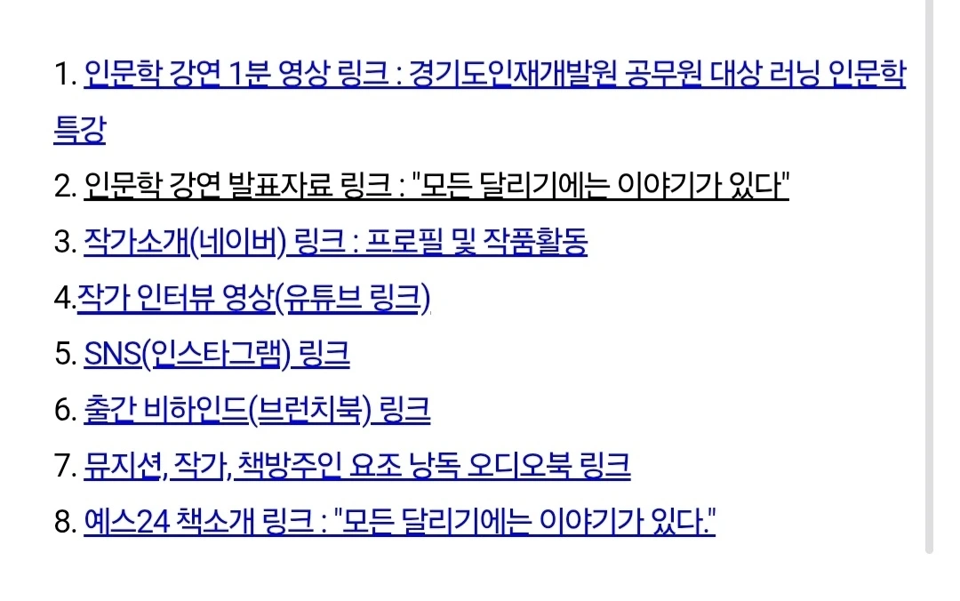 다섯 번째는 입증자료. 담당자님이 검색 없이 클릭만으로 나의 모든 활동을 한눈에 볼 수 있도록 링크를 달았다. 월요일 강연영상을 웹하드에 올려서 링크만으로 실제 강연영상을 확인할 수 있도록 하고 발표자료도 볼 수 있도록, 네이버 작가소개, 유튜브 인터뷰영상, 인스타그램 링크, 출간비하인드 브런치북 링크, 오디오북 링크, 책소개 링크까지.