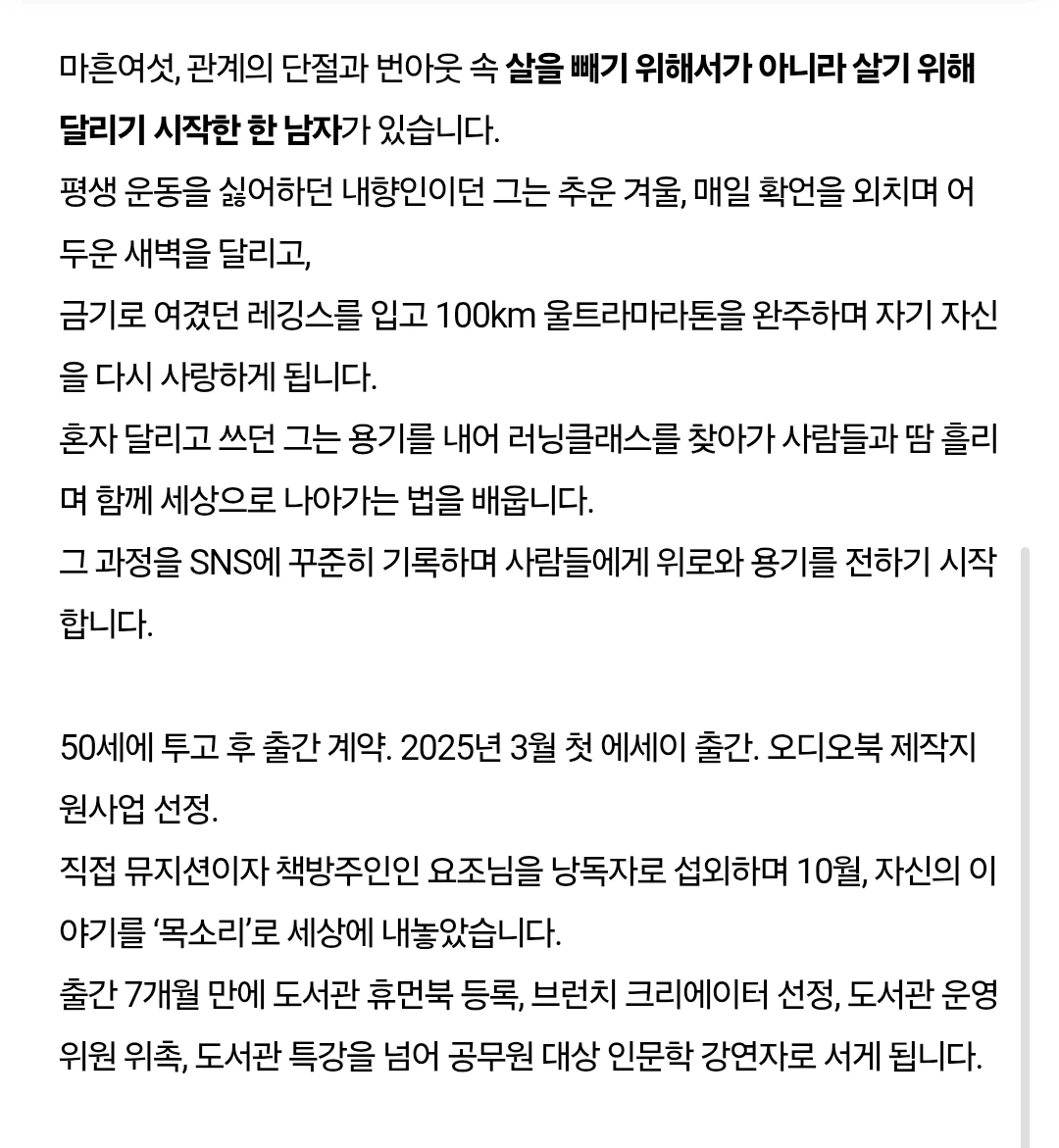"혼자 달리고 쓰던 그는 용기를 내어 러닝클래스를 찾아가 사람들과 땀 흘리며 함께 세상으로 나아가는 법을 배웁니다. 그 과정을 SNS에 꾸준히 기록하며 사람들에게 위로와 용기를 전하기 시작합니다. 50세에 투고 후 출간 계약. 2025년 3월 첫 에세이 출간하고 오디오북 제작 지원사업에 선정됩니다."