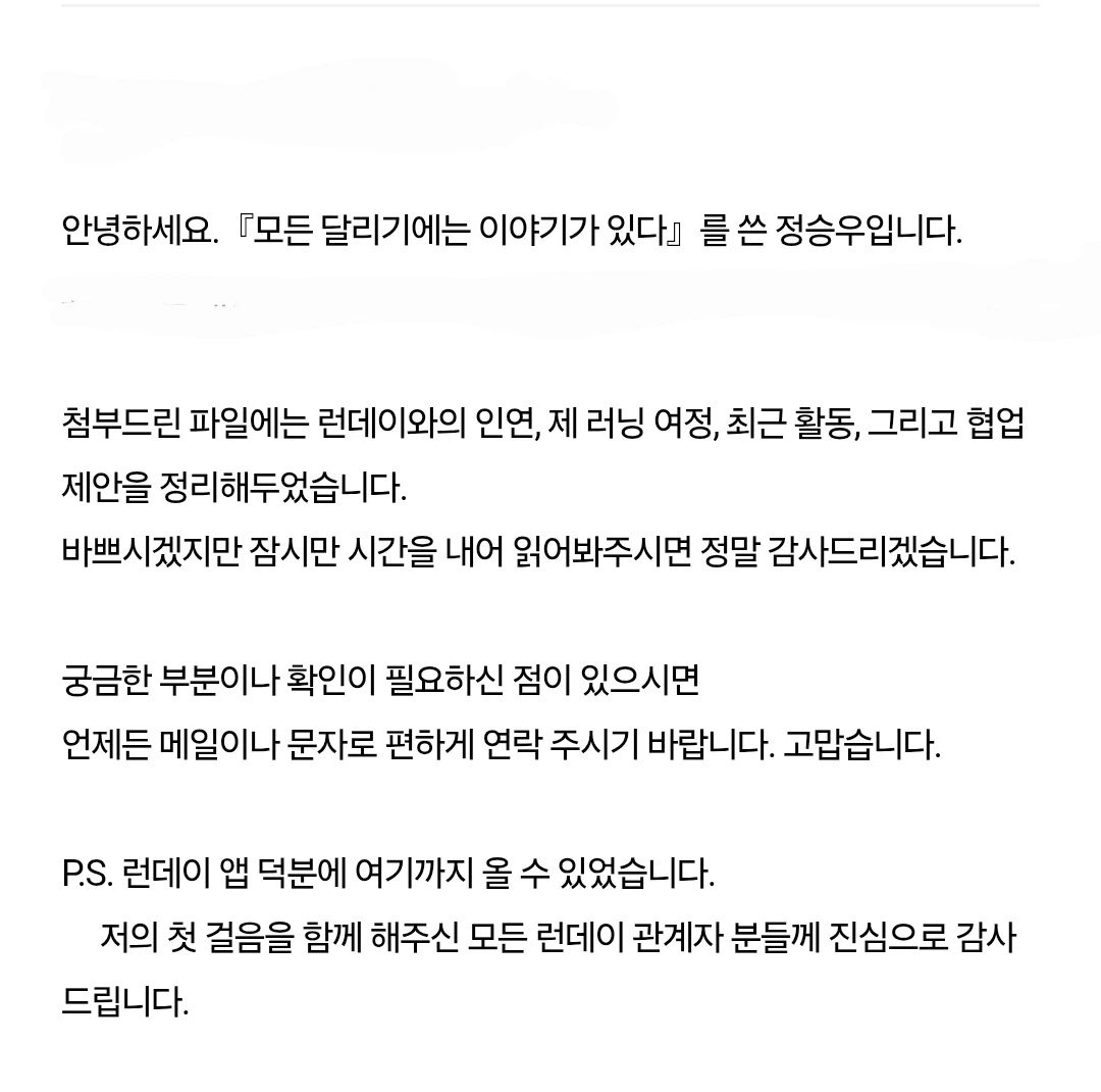 5년의 기록을 담아 런데이에 협업 제안서를 보냈다. 런데이는 나에게 달리기를 알려준 앱이 아니라, 삶을 다시 시작하게 해준 첫 출발선이었다.