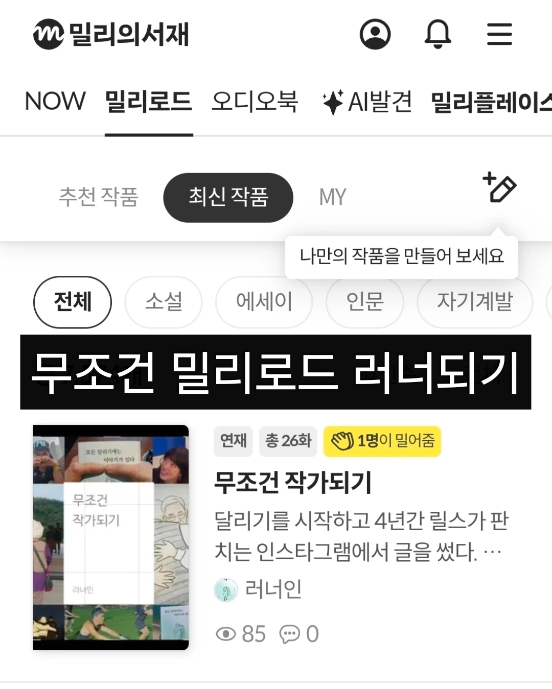 '무조건 작가 되기'란 제목으로 썼던 30편의 에세이를 밀리로드에 올리기 시작했다. 밤 10시 30분에 시작한 작업이 새벽 3시가 넘어 끝났다. 3편을 남기고 27편을 한꺼번에 올렸다. 꾸준히 연재하신 분 중 인기 있는 에세이는 벌써 조회수가 몇천이고 밀어주기도 80회가 넘었지만 신경 쓰지 않기로 했다. '언제 내가 누울 곳 보고 뛰었나?' 허공을 향해 발을 뻗듯 일단 지르기로 했다. 다 올릴까 하다가 말일까지 하루에 하나씩 올릴 생각에 몇 편을 남겼다.
