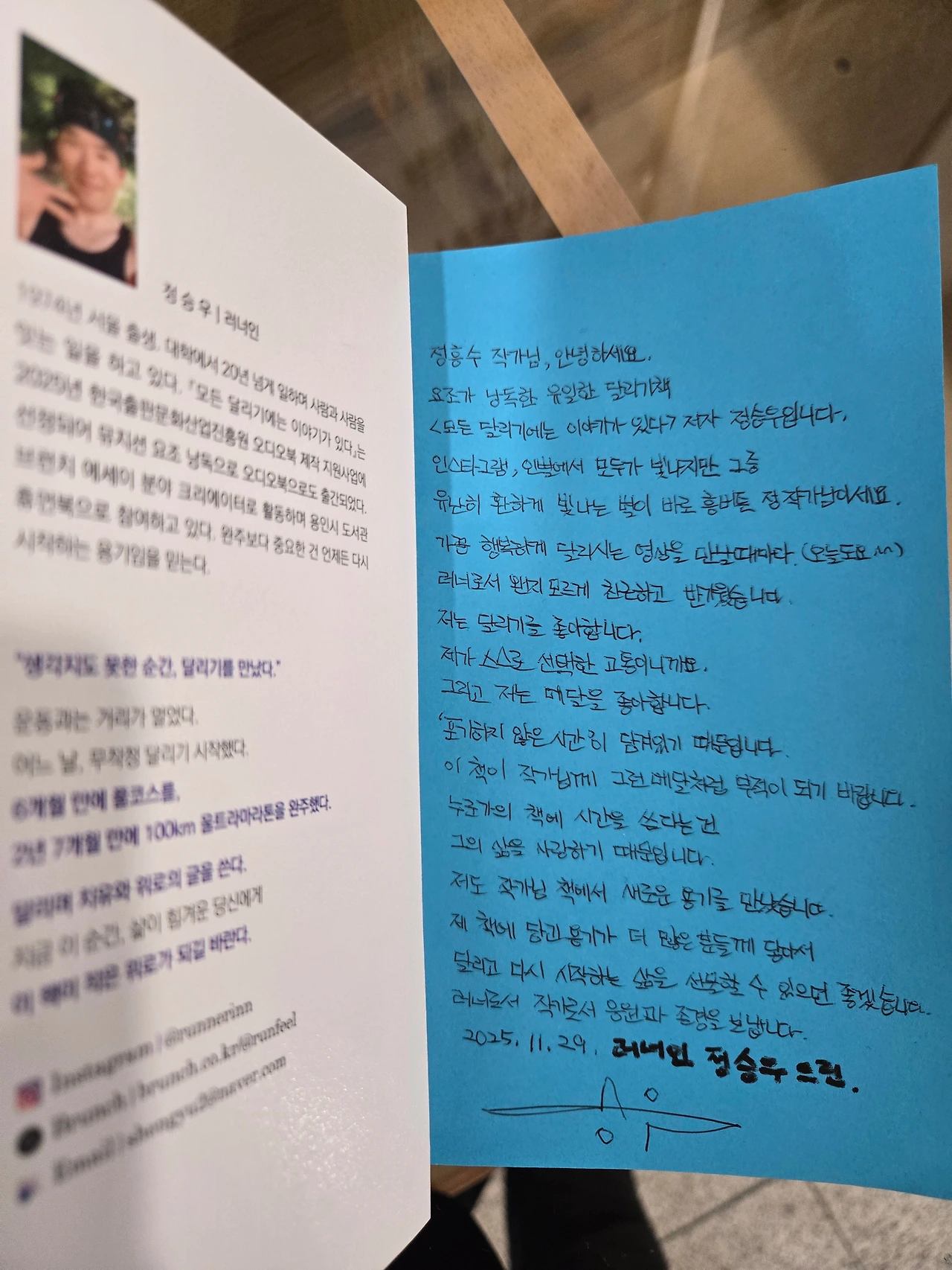 출발 전 내가 쓴 달리기 책을 가방에 넣었다. 정흥수 작가님이 종종 달리기 영상을 올리시는 걸 기억하고 있었다. 오늘도 뛰셨다고 했다. 러너가 러너에게 줄 수 있는 최고의 선물은 러닝책이 아닐까? 책 속지에 이렇게 손글씨로 적었다.