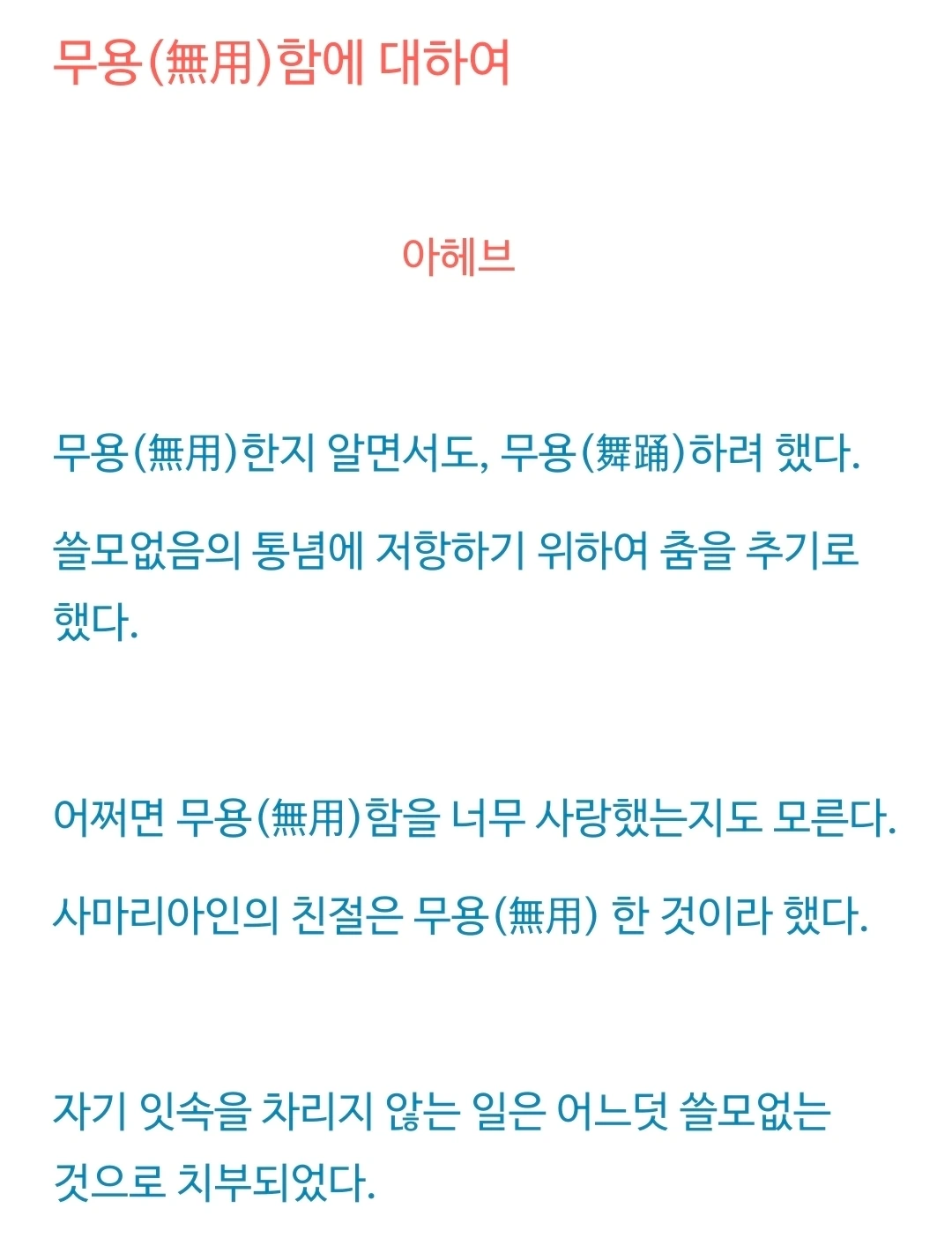 '무용'은 '쓸모없음'이 아니다. 세상을 향한 몸짓이고 나비의 춤사위다. 나는 새벽마다 나를 위해 쏟는 시간에서 30분을 떼어낸다. 갈라진 목을 가다듬고 녹음기를 켠다. 이 무용한 낭독이 이상하게도 가끔 나의 하루를 안아준다.