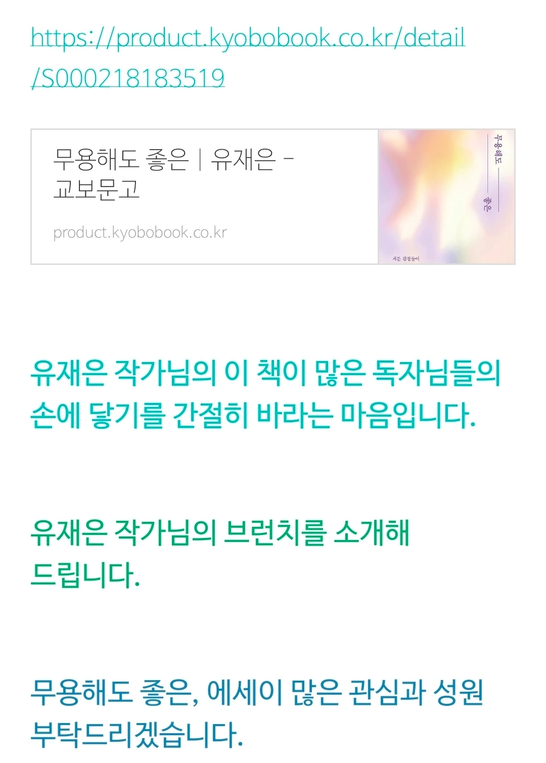 아헤브 작가님의 최신 글에서 '유재은' 작가님의 '무용해도 좋은...'이라는 책소개를 만났다. 아름다운 문장에 마음을 빼앗겼다. 짧게 낭독하고 사라지려 했는데, 글에 소개된 책에 마음이 쓰였다. 낭독은 신간 소개로 이어졌고, 나는 인스타에서 유재은 작가님을 찾아 팔로우했다. 그리고 홀린 듯 책을 구매하고 인증사진을 DM으로 보냈다.