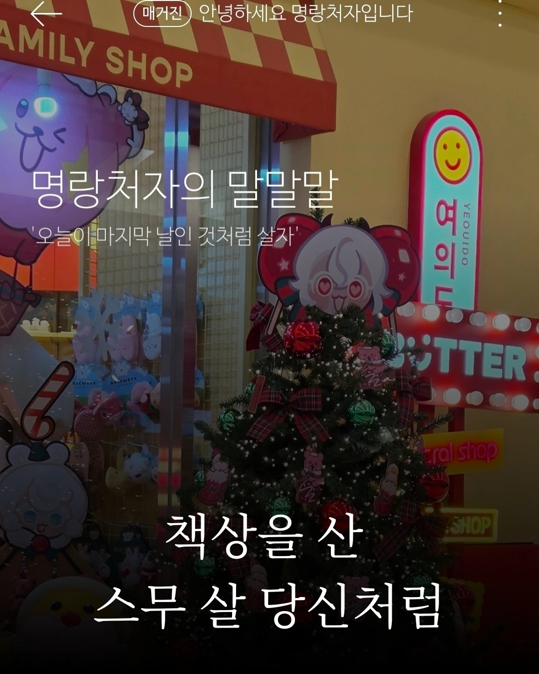 "어릴 적부터 내 물건을 가져보지 못했기에 스무 살에 처음 내 돈으로 책상을 샀다. - 명랑처자의 말말말-" 오늘 명랑처자님 글을 낭독하며 나에겐 무엇이 처음 내가 나를 위해 해준 선물이었을까 생각해 본다.