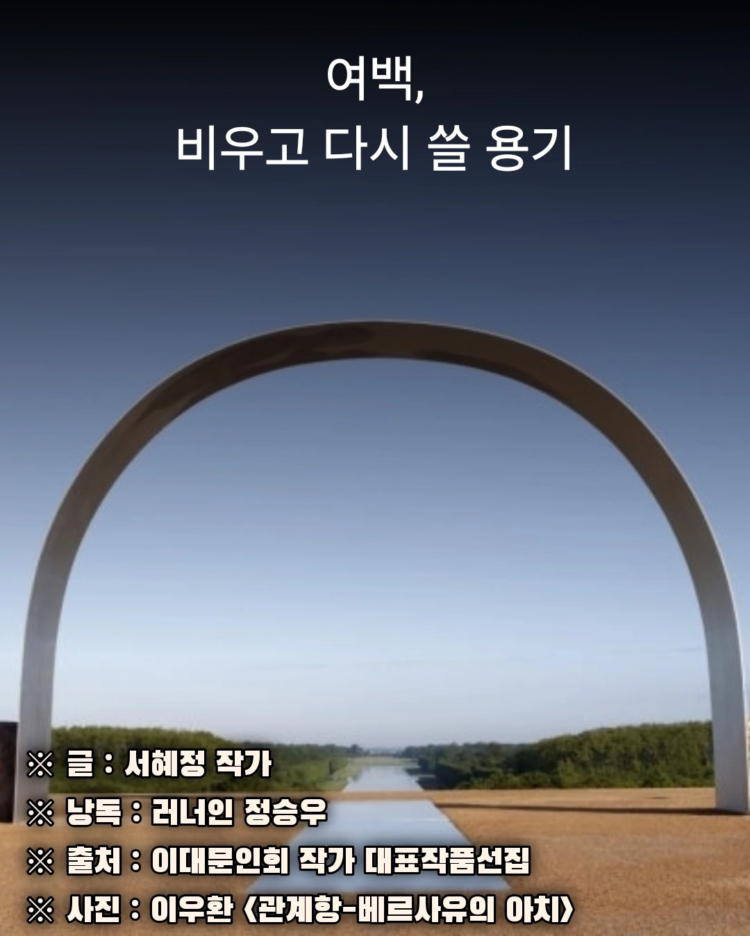 여백의 시간, 가능성의 공간에 서서 가만히 제 자신을 바라보는 중입니다. 달리기, 글쓰기, 어쩌면 이 낭독도 제게는 또 다른 의미의 여백, 숨 쉴 수 있는 틈이고 세상으로 향하는 문이 아닐까 합니다.
