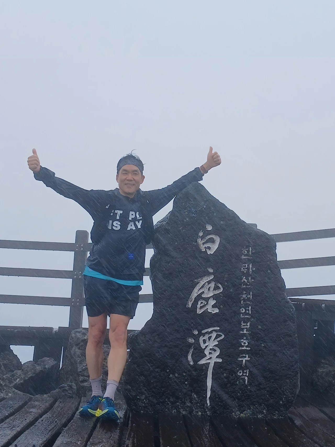 얼어 죽어도 아메리카노가 아니라 얼어 죽어도 싱글렛을 입어야 진짜 러너지만, 이젠 살기 위해서 겉옷을 입어야 했다. 시작부터 비에 젖어 축축해진 바람막이를 다시 꺼내 입고 정상을 향해 돌을 밟는다. 한 치 앞이 안 보이는 비현실적인 안개와 비바람에도 오히려 정신은 또렷하다.