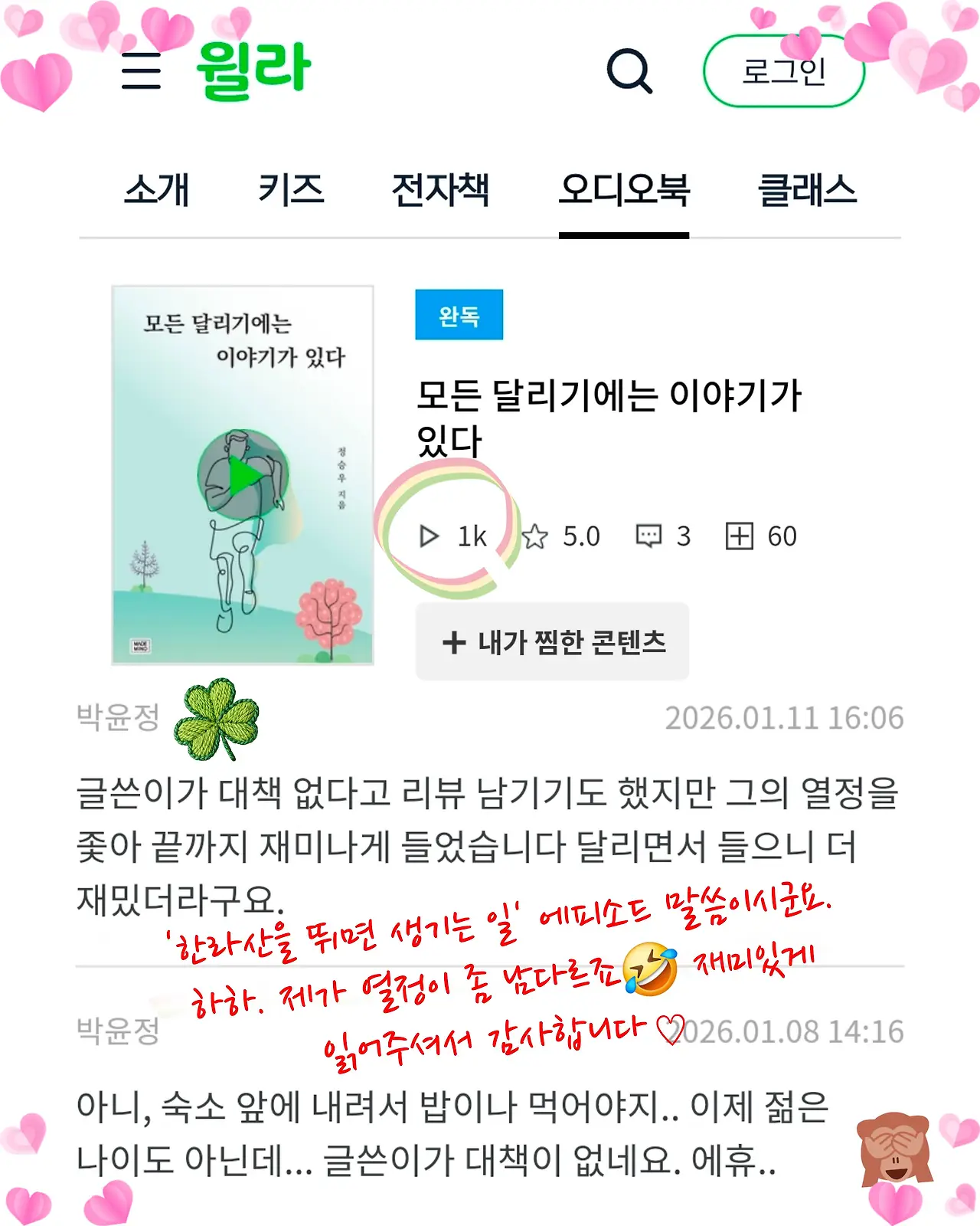 윌라에 가보니 어느새 오디오북을 들어주신 분들이 1,000명(1k)을 넘었다. 어느 분이 남긴 두 개의 댓글에 웃음이 터졌다. 챕터 2. 낯선 즐거움. <한라산을 뛰면 생기는 일> 에피소드를 듣고 쓰신 댓글이다.