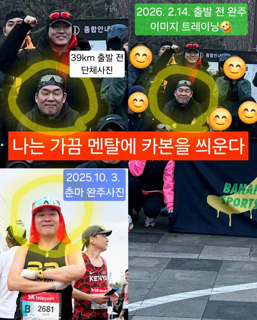 장거리 출발 전 바나나 러너들이 모여 단체사진을 찍었다. 일부러 그때 나는 팔짱을 낀 채 눈을 감았다. 작년 춘천마라톤에서 3시간 29분 완주 후 세상 초연한 얼굴로 눈 감고 팔짱을 낀 채 미소 짓고 있던 완주 사진처럼. 파이팅 대신 눈을 감고 ‘춘마에서 완주 후 웃으며 찍었던 그 순간’을 상상했다. 그때 춘마 피니시처럼, 오늘 완주할 것이라는 이미지 트레이닝을 했다. (단체사진 확대하면 혼자 눈 감고 있는 내 사진이 있다)