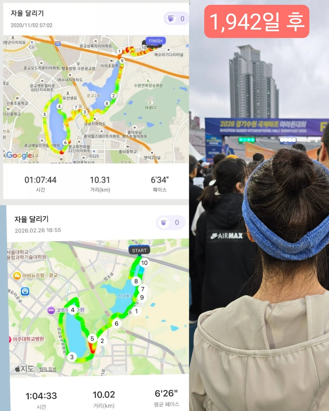 5년 전 처음 10km를 완주하고 벅차올랐던 나의 그때를 떠올랐다. 응원해 주는 사람이 아무도 없었지만 외롭지 않았다. 세상을 다 가진 듯한 그 뿌듯한 성취와 해냈다는 자존감이 온몸을 휘감았다.