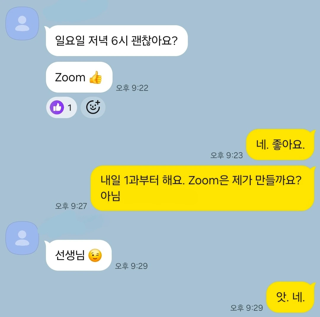 “네. 일요일 저녁 6시. zoom.”