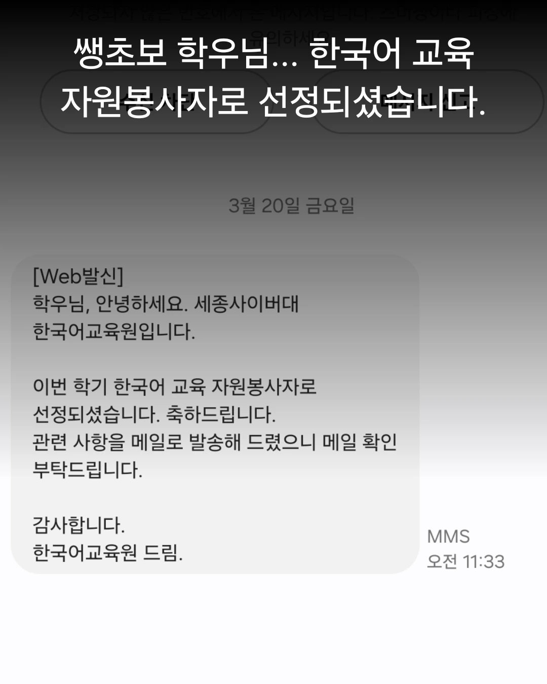 “학우님, 안녕하세요. 세종사이버대 한국어교육원입니다. 이번 학기 한국어 교육 자원봉사자로 선정되셨습니다. 축하드립니다. 관련 사항을 메일로 발송해 드렸으니 확인 부탁드립니다. 감사합니다.”