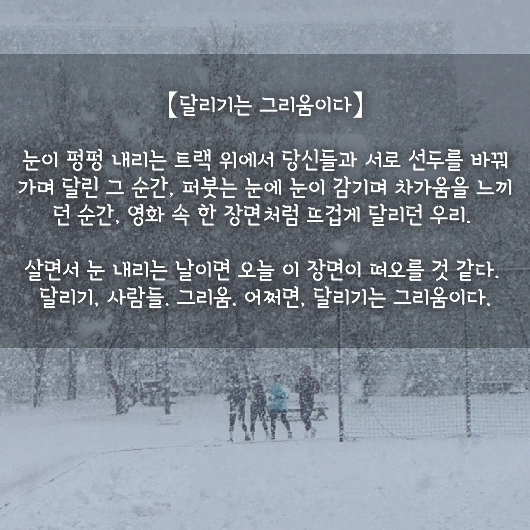 눈이 펑펑 내리는 트랙 위에서 당신과 서로 선두를 바꿔가며 달린 그 순간, 퍼붓는 눈에 눈이 감기며 차가움을 느끼던 순간, 영화 속 한 장면처럼 뜨겁게 달리던 우리.