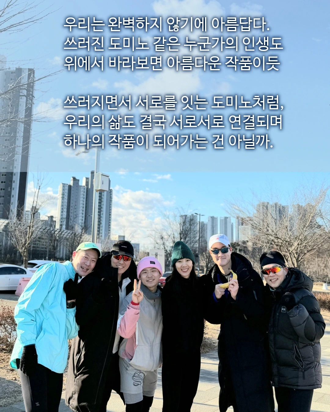 함께 바나나를 먹으며 떠올렸다. 각자의 속도로 넘어지고 다시 일어나며 만드는 도미노 같은 삶. 쓰러지고 다시 일어나며 그리는 우리의 도미노, 아름다운 그림.