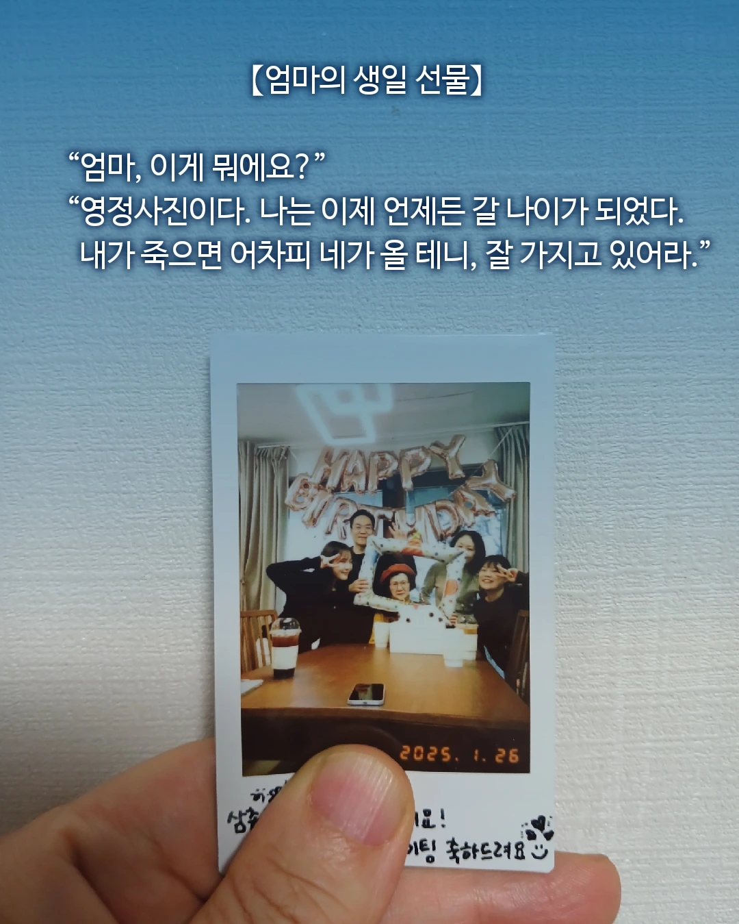 엄마는 차분히 자신의 마지막을 준비하고 계셨다. 우리가 언제라도 이별할 수 있다는 걸 아시는 엄마는, 나중에 남겨질 내가 당황하지 않도록, 당신의 생일날 미리 내게 영정사진을 건넸다.