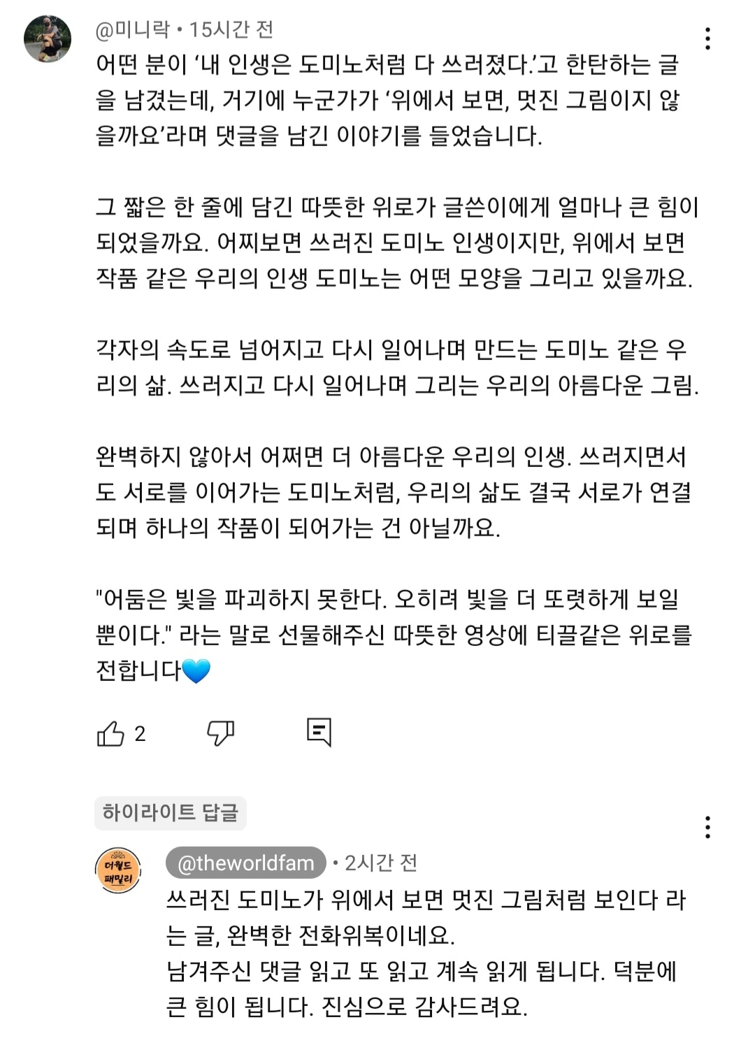 그 짧은 한 줄에 담긴 따뜻한 위로가 글쓴이에게 얼마나 큰 힘이 되었을까요. 어찌 보면 쓰러진 도미노 인생이지만, 위에서 보면 작품 같은 우리의 도미노는 지금 어떤 모양을 그리고 있을까요.