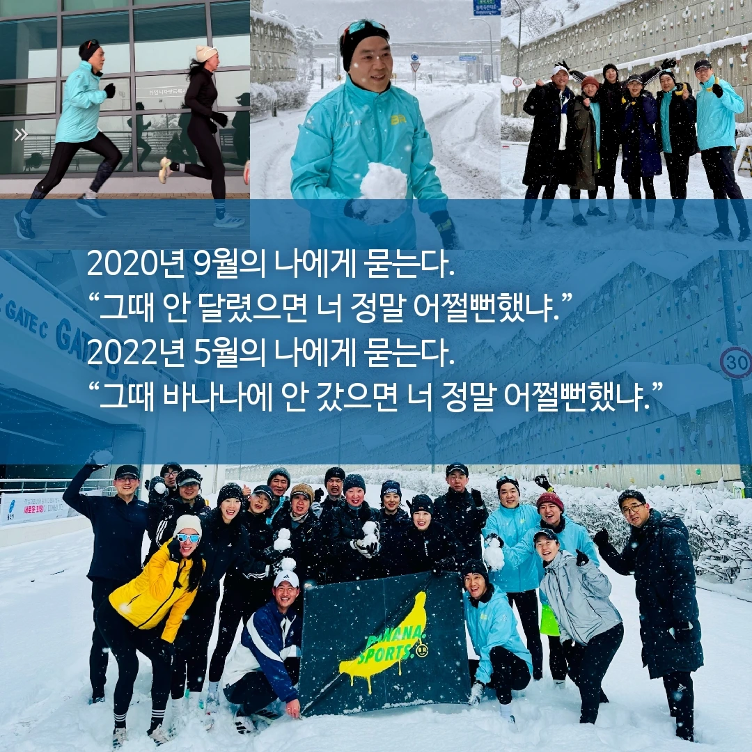 폭설에도 훈련장으로 데려다준 고마운 민원님, 휴일에도 클래스를 열어주신 연진 코치님, 서윤 코치님, 매니저님, 희준 님. 이런 날 훈련에 누가 나올까 싶어도 눈을 헤치고 나타나는 뜨거운 바나나 러너 분들.
