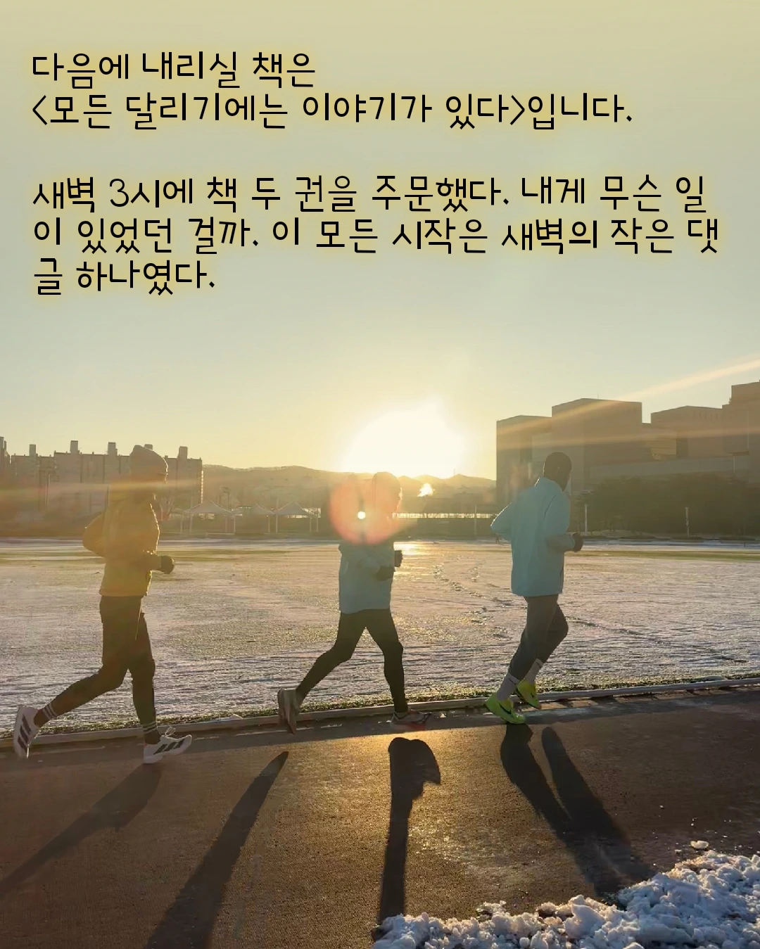 나는 이 책에 기록과 숫자 뒷 이야기를 담았다. 나는 믿는다. 특별하지 않은 일상의 달리기 한 번에도 각자의 이야기가 스며 있다고. 이 모든 시작이 된 새벽의 작은 댓글 하나처럼.