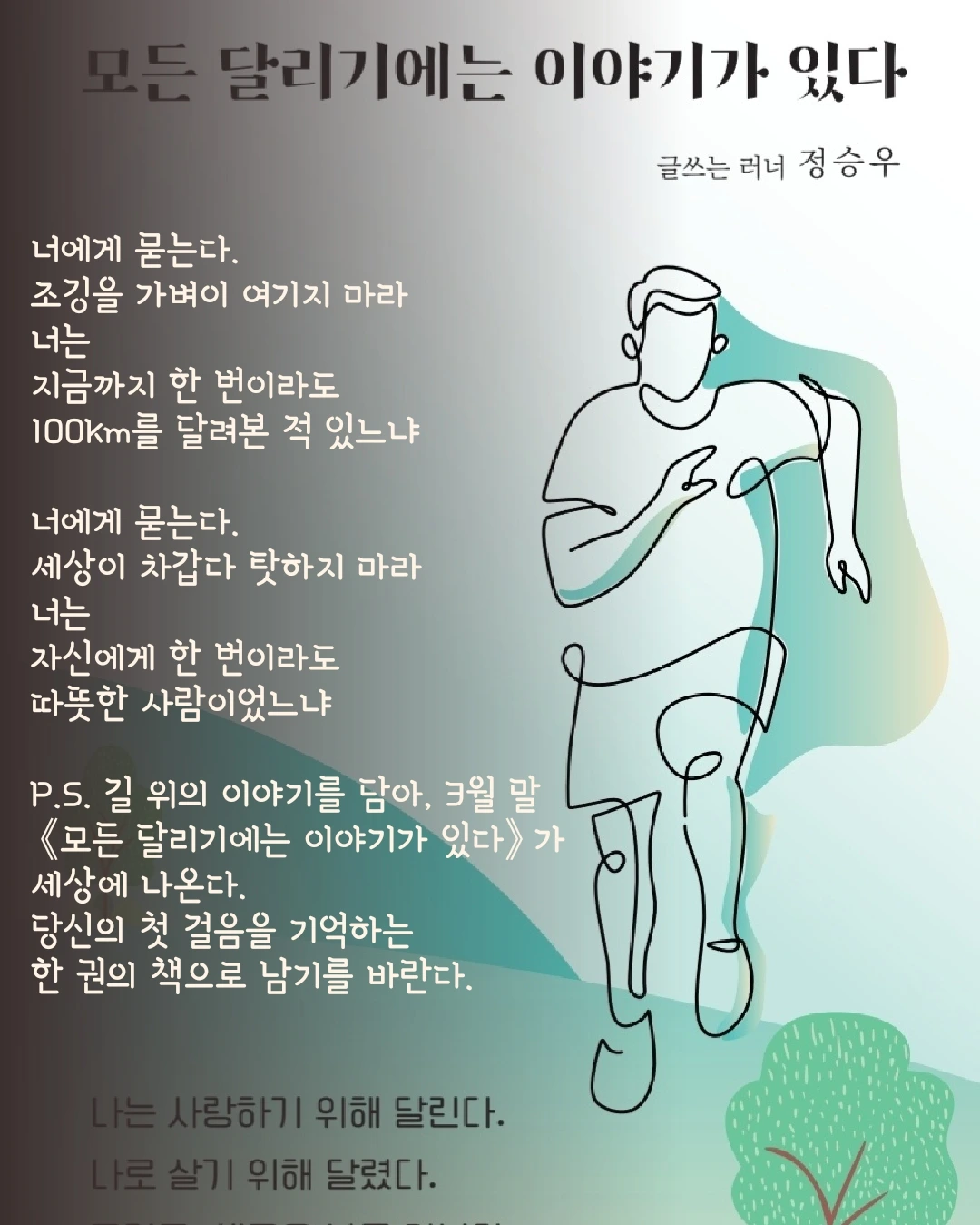 P.S. 길 위의 이야기를 담아, 오는 3월 말 《모든 달리기에는 이야기가 있다》가 세상에 나온다. 당신의 첫걸음을 기억하는 한 권의 책으로 남기를 바란다.