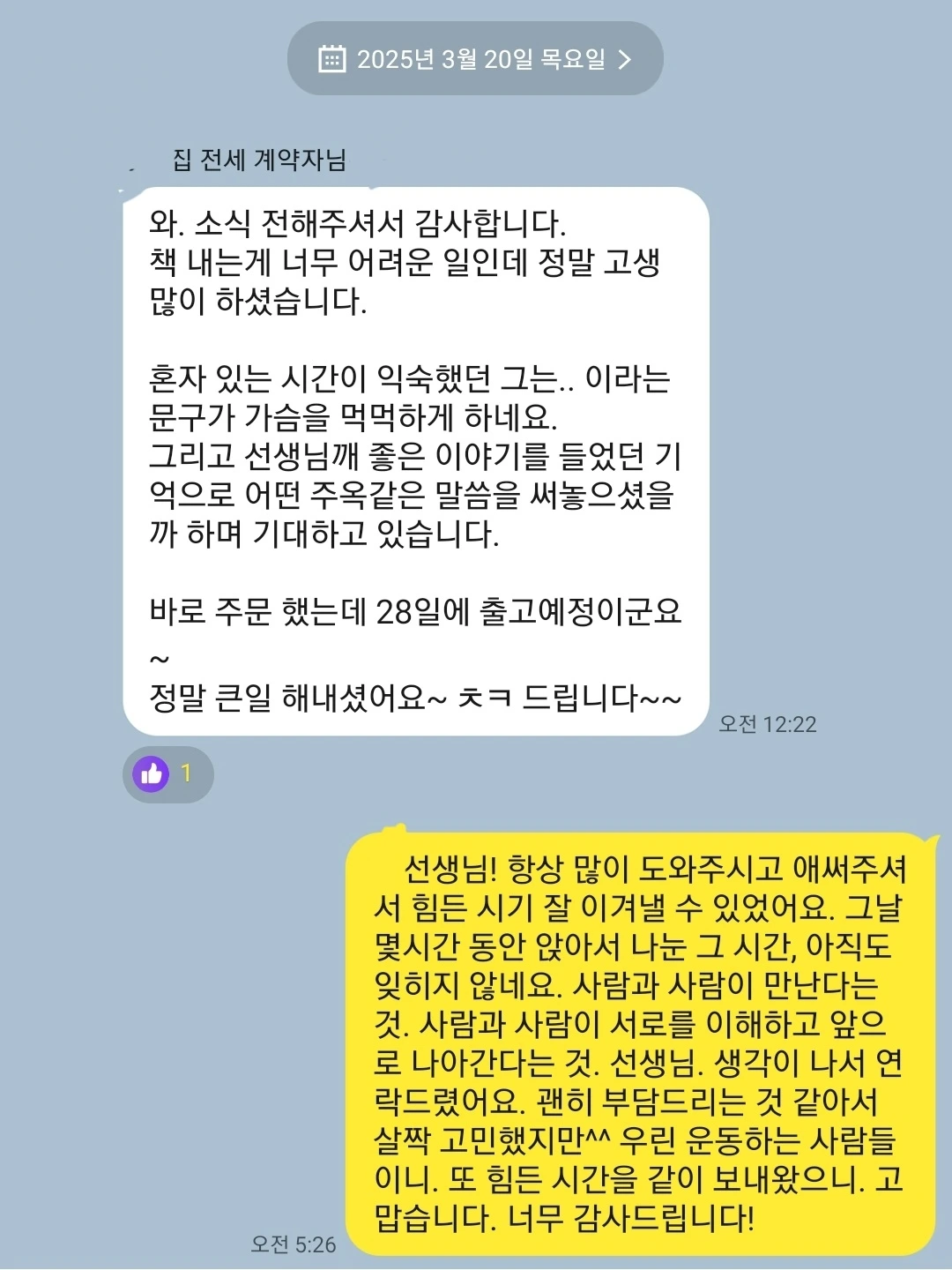 "선생님. 책 나오면 꼭꼭 연락 주세요. 꼭 살게요. 진심이에요."