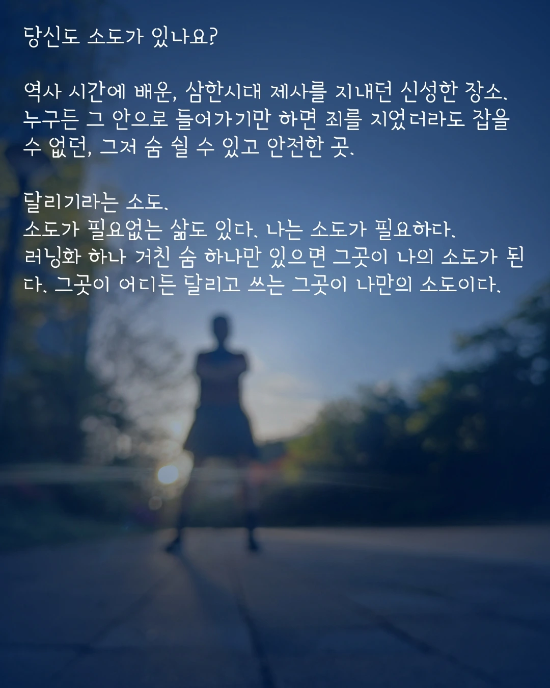 러닝화 하나 거친 숨 펜 하나만 있으면 그곳이 소도가 된다. 어디든 달리고 쓰는 그곳이 나만의 소도이다.