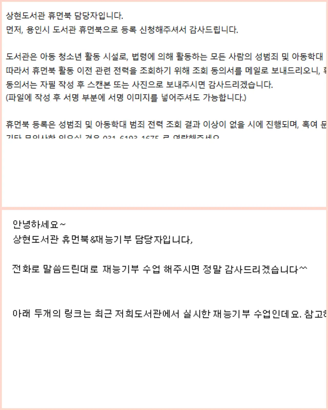 며칠 전 휴먼북 라이브러리 등록 신청서를 냈다. 사람이 한 권의 책이라는 휴먼북. 어떻게 되고 있을까 궁금했는데 도서관에서 전화가 왔다. 잘 받았다는 이야기와 함께 혹시 재능기부로 강의도 가능한지 묻는 담당자님.(안 그래도 북토크 가능한지 여쭈려고 했는데...)