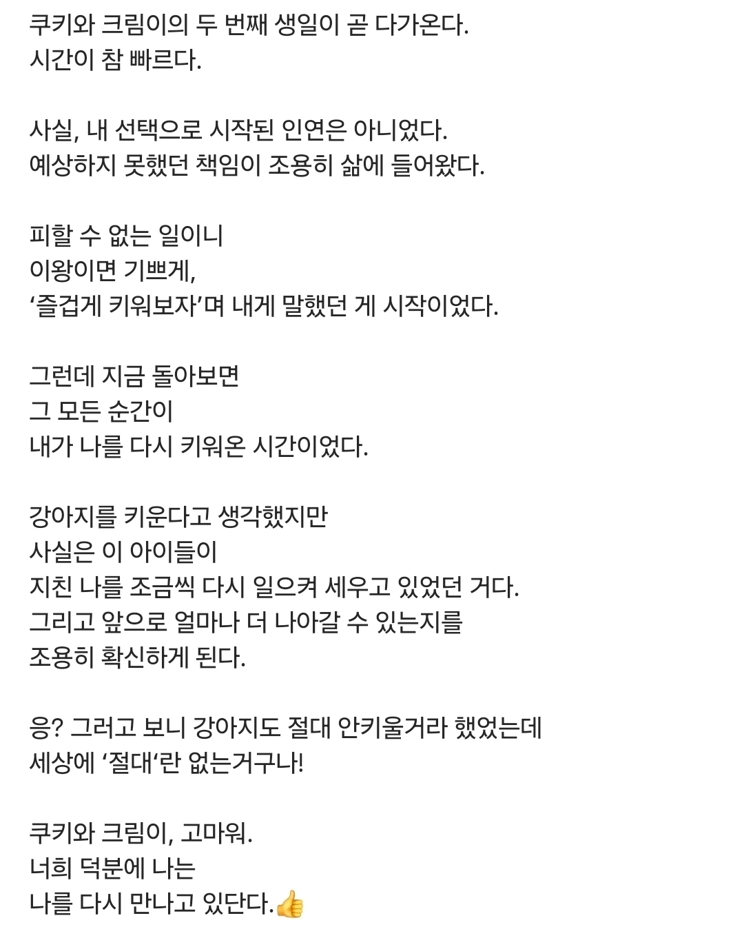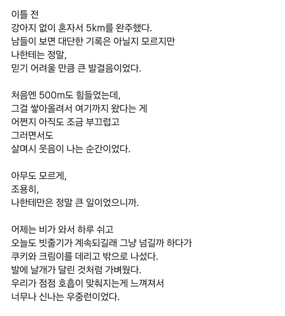 정말 축하해. 너의 첫 5km 완주를. 달리면 달릴수록 너는 너를 믿게 될 거야. 너의 가짜 목소리가 아닌 진짜 너의 목소리를 듣게 될 거야.