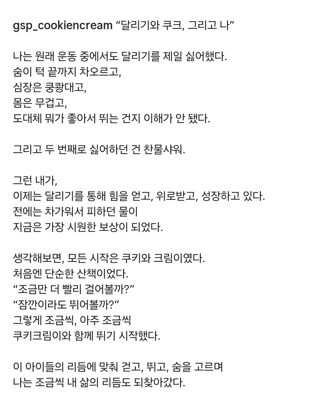 떨림 가득한 너의 후기에 나도 기뻐. 절대 달리기는 안 할 거라 다짐했는데 어느새 러너가 되었다는 너처럼 5년 전 나도 그랬었지. 달리기? 그런 걸 왜 하지?
