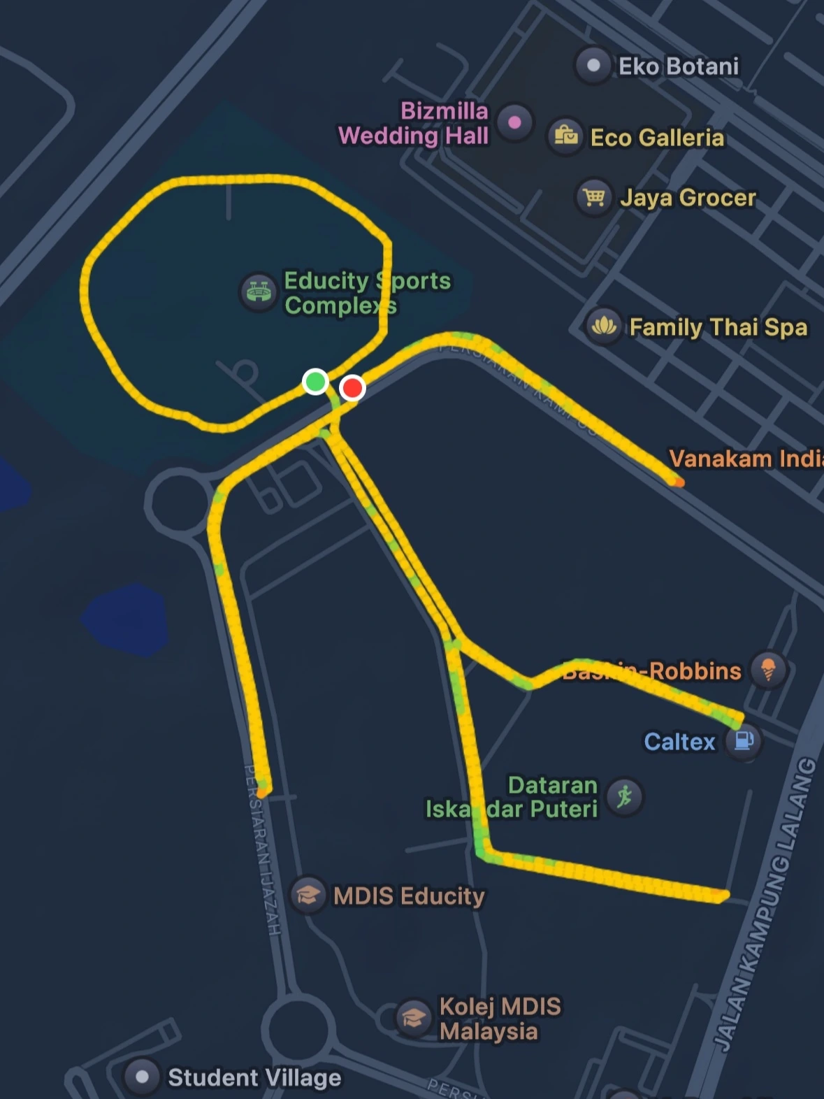 에듀시티 스포츠 콤플렉스(Educity Sports Complex)을 출발점으로 삼으면 자연스럽게 '러너 아트런'을 즐길 수 있다. 학교와 호스텔이 밀집한 지역이라 야간에도 비교적 안전하고 차량 통행이 많지 않아 호흡을 유지하기 좋다. 현재 육상 트랙은 사용이 불가능하지만, 수영장, 풋살, 농구, 배드민턴 등 다양한 운동 시설을 함께 이용할 수 있어 크로스 트레이닝 장소로는 충분하다.