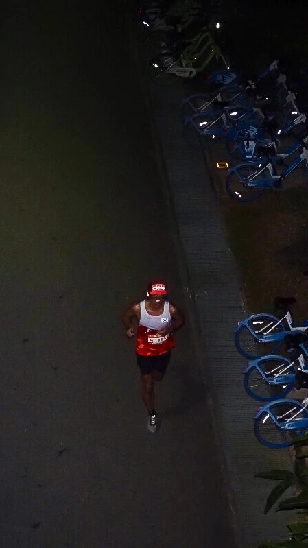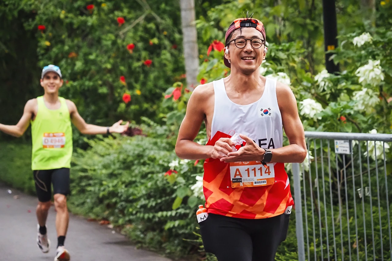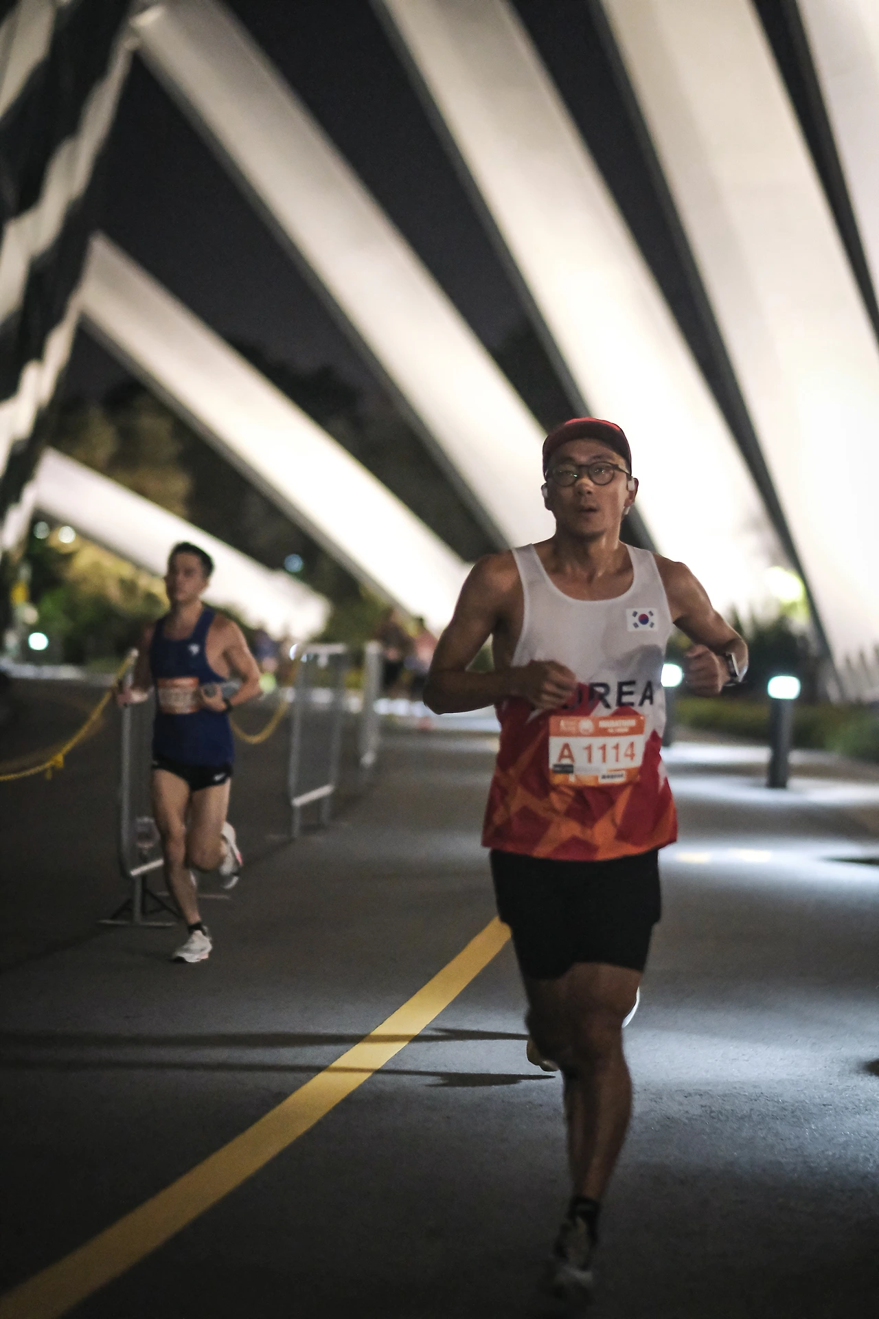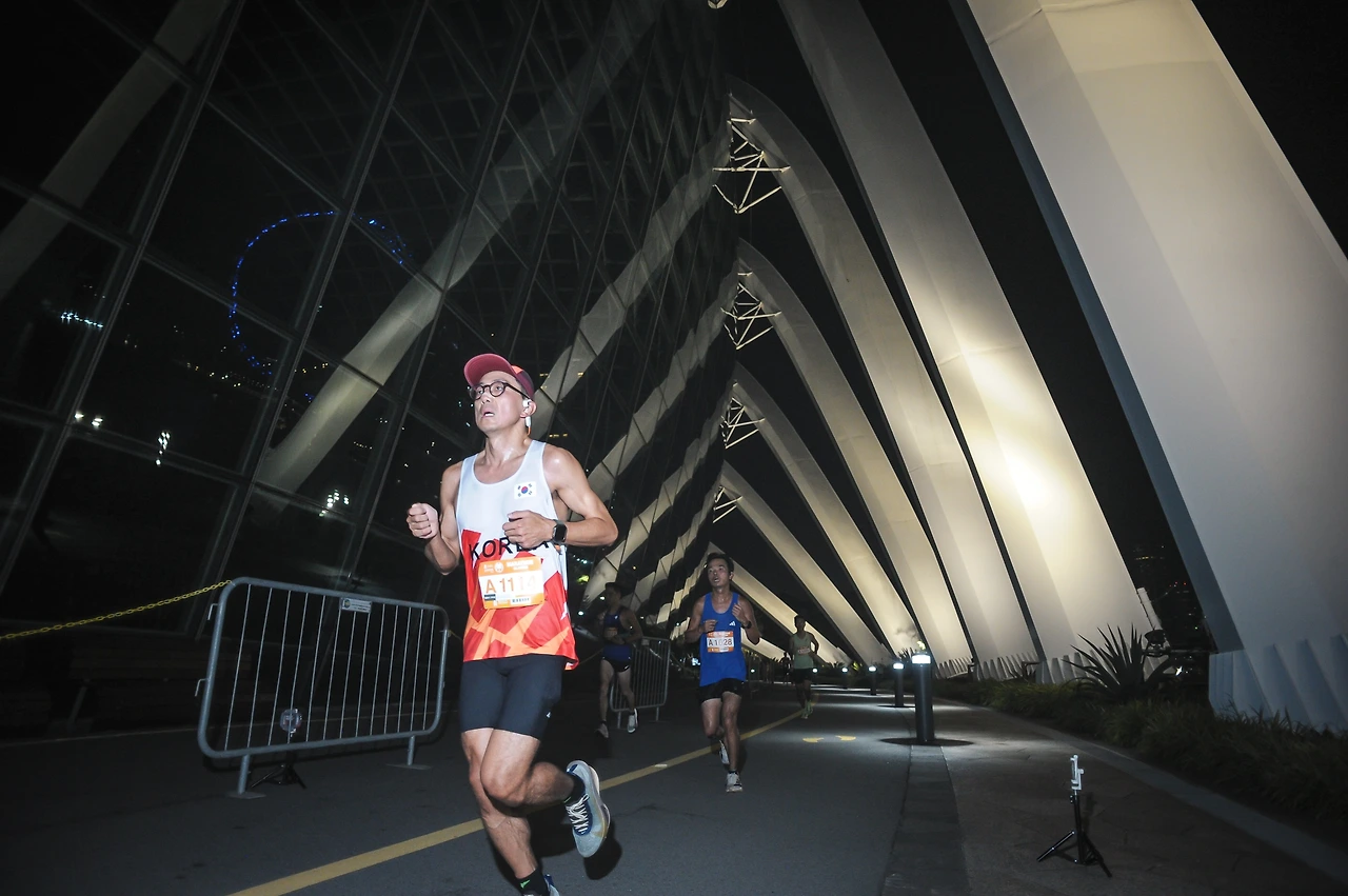 10킬로미터 지점까지는 모든 것이 순조로웠다. 숨은 고르게 이어졌고 심장은 안정적이었다. 수많은 러너를 추월하고 또 추월당하며 비교적 높은 순위로 달리고 있었다. 덕분인지 이른 아침 싱가포르의 초록이 유난히 선명해 보였다. 가든스 바이 더 베이를 가득 메운 가로수 사이로 스며드는 습한 공기, 물을 건네는 자원봉사자의 손짓, 이름 모를 이가 전해주는 응원. 그 모든 것이 나를 앞으로 밀어주고 있었다. 에너지 젤을 먹으며 확인한 속도는 나쁘지 않았고, 발목 또한 잘 버티고 있었다.