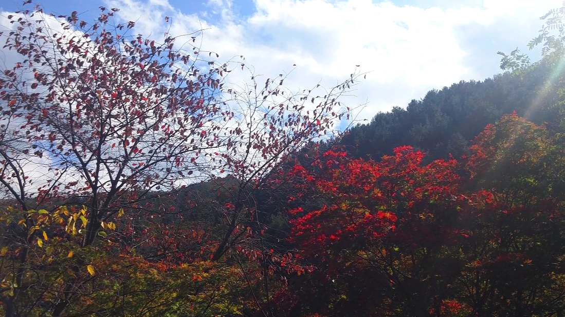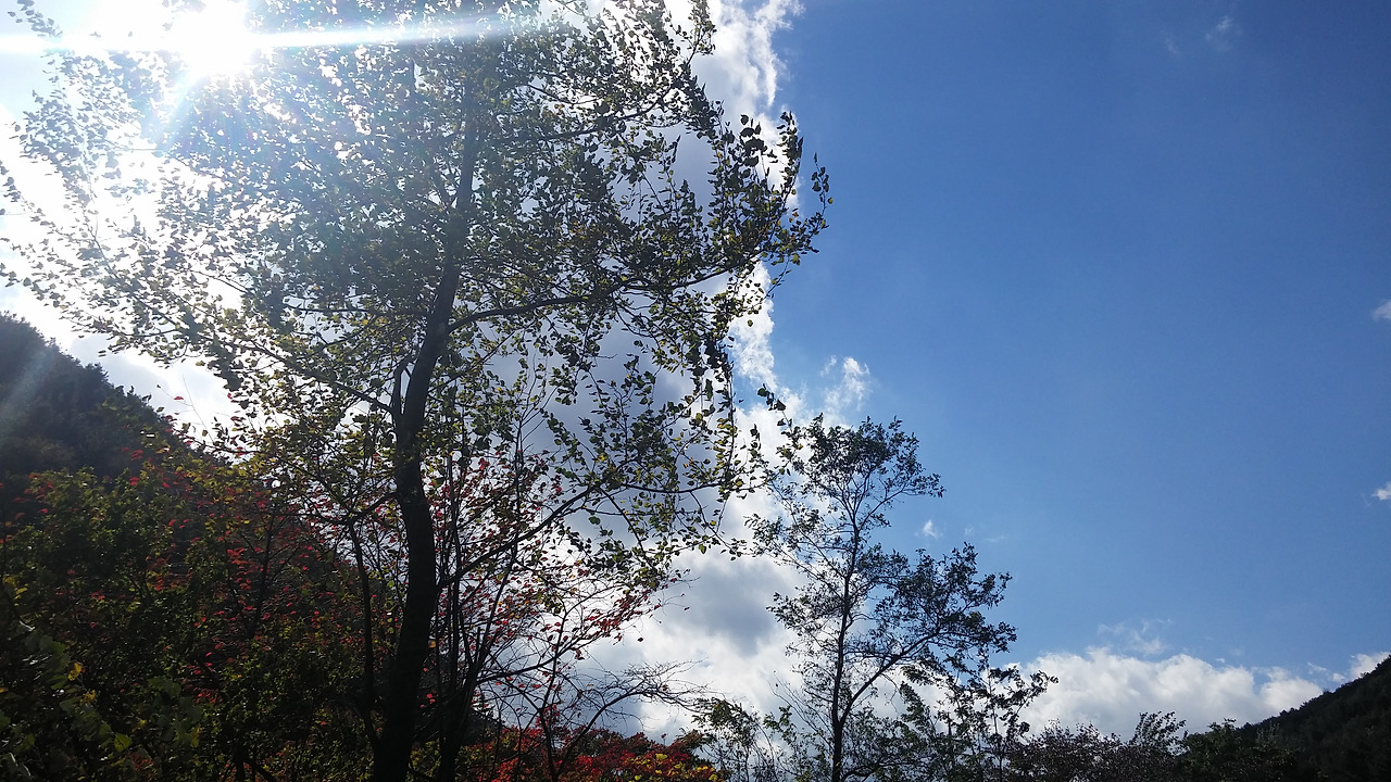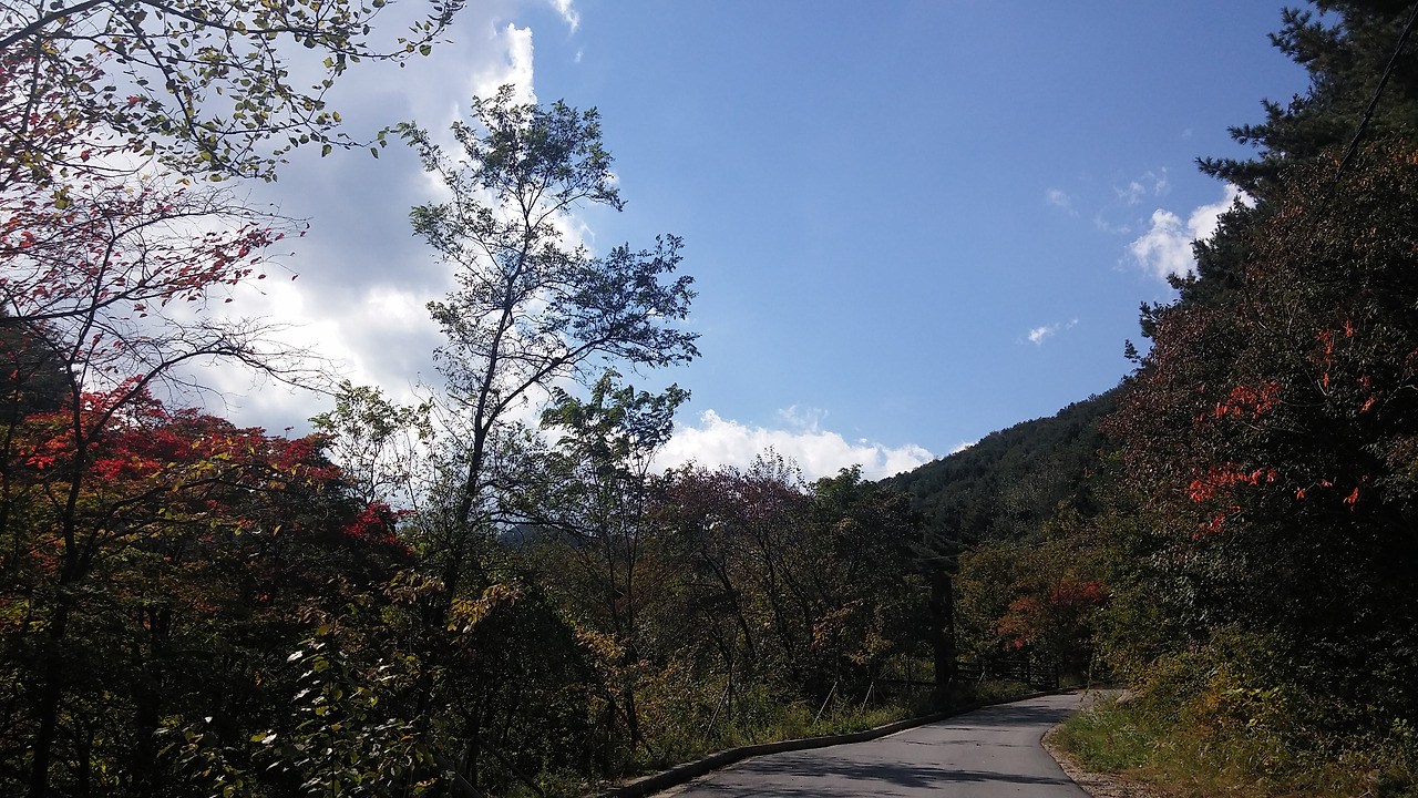 흰 구름을 어깨동무한 하늘의 깨끗한 푸르름. 색감이 그지없이 맑고 투명하다. 그 하늘 아래 사이 사이 가을을 받아들여야하는 초목들은, 남아있는 자신의 푸르른 색을 덜어내느라 더없이 분주하다.