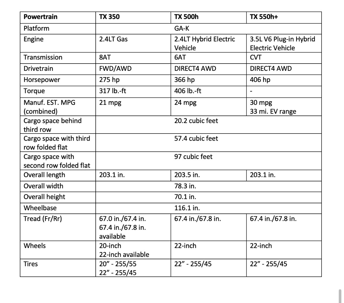 TX는 TX 350, TX 500h, TX 550h+ 세 가지 파워트레인 옵션을 갖추고 있습니다. TX 350 모델은 2.4리터 터보차저 인라인 4기통 엔진을, TX 500h는 2.4리터 터보차저 하이브리드 엔진을, 그리고 TX 550h+는 3.5리터 V6 플러그인 하이브리드 엔진을 탑재합니다. TX 350은 표준, 프리미엄, 럭셔리 등급으로 제공되며, TX 500h는 F SPORT 성능 프리미엄 및 럭셔리 등급으로만 제공됩니다. TX 550h+는 럭셔리 등급으로 제공되며, 약 53km 전기 주행이 가능합니다. 모든 옵션은 최대 2,268kg까지 견인할 수 있는 능력을 자랑합니다.
