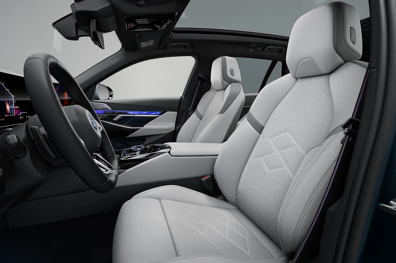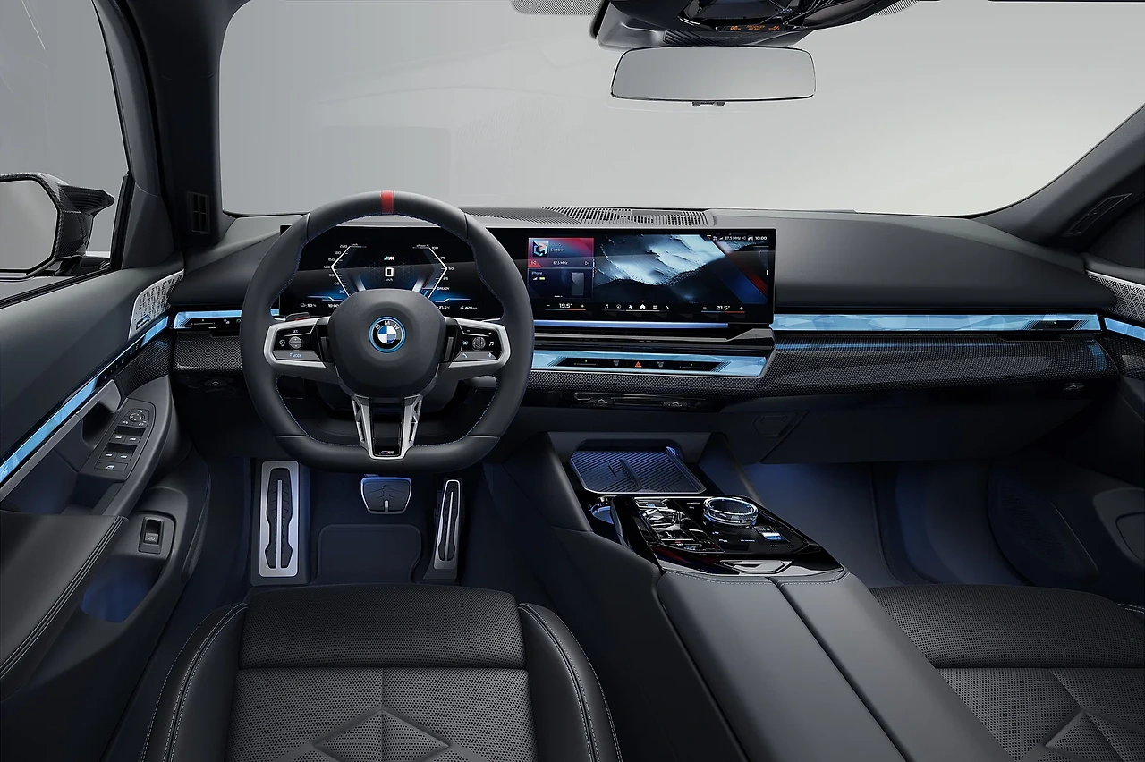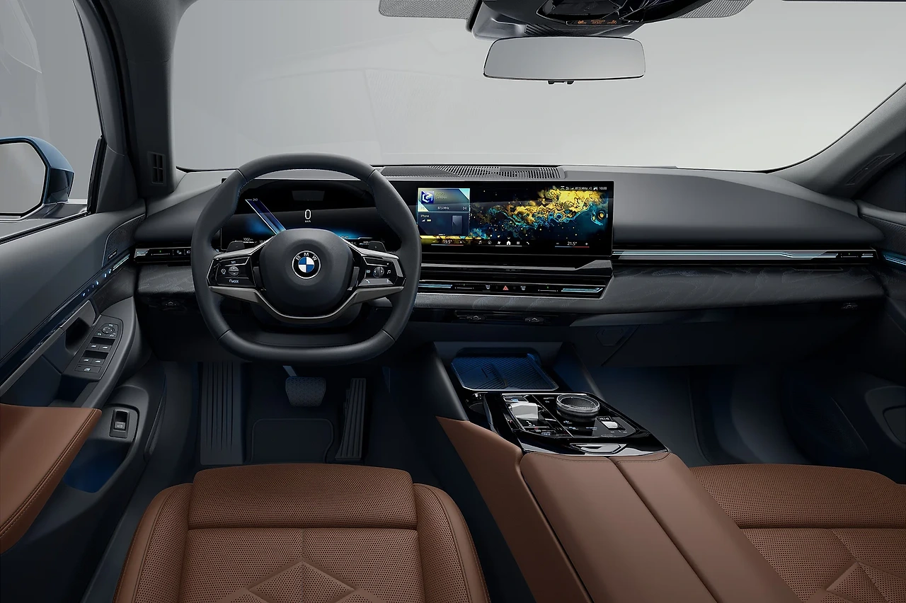 BMW 5시리즈 투어링은 넓은 공간과 고급스러움을 강조한 실내 디자인을 특징으로 합니다. 표준 상태에서 트렁크 공간은 569리터를 제공하며, 후방 좌석을 접으면 최대 1699리터까지 활용 가능합니다. 비건 소재가 기본으로 제공되며, 원하는 경우 고급 가죽 옵션을 선택할 수 있습니다. 또한, 18스피커 Bowers & Wilkins 서라운드 사운드 시스템과 파노라믹 글래스 루프와 같은 고급 옵션도 제공됩니다.