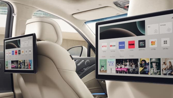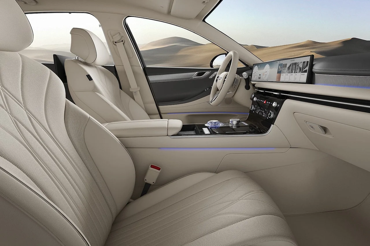 실내에는 27인치 대형 와이드 디스플레이가 설치되어 있어, 운전하시는 분들에게 다양한 정보와 재미있는 콘텐츠를 한눈에 보여줍니다. '후석 스마트 엔터테인먼트 시스템'이라는 옵션 덕분에 뒷자리 승객들도 각자 원하는 프로그램을 따로 즐길 수 있어요. 또한, 뱅앤올룹슨의 고급 오디오 시스템이 차 안의 소리를 더욱 풍부하게 해주어 듣는 즐거움을 높여줍니다.