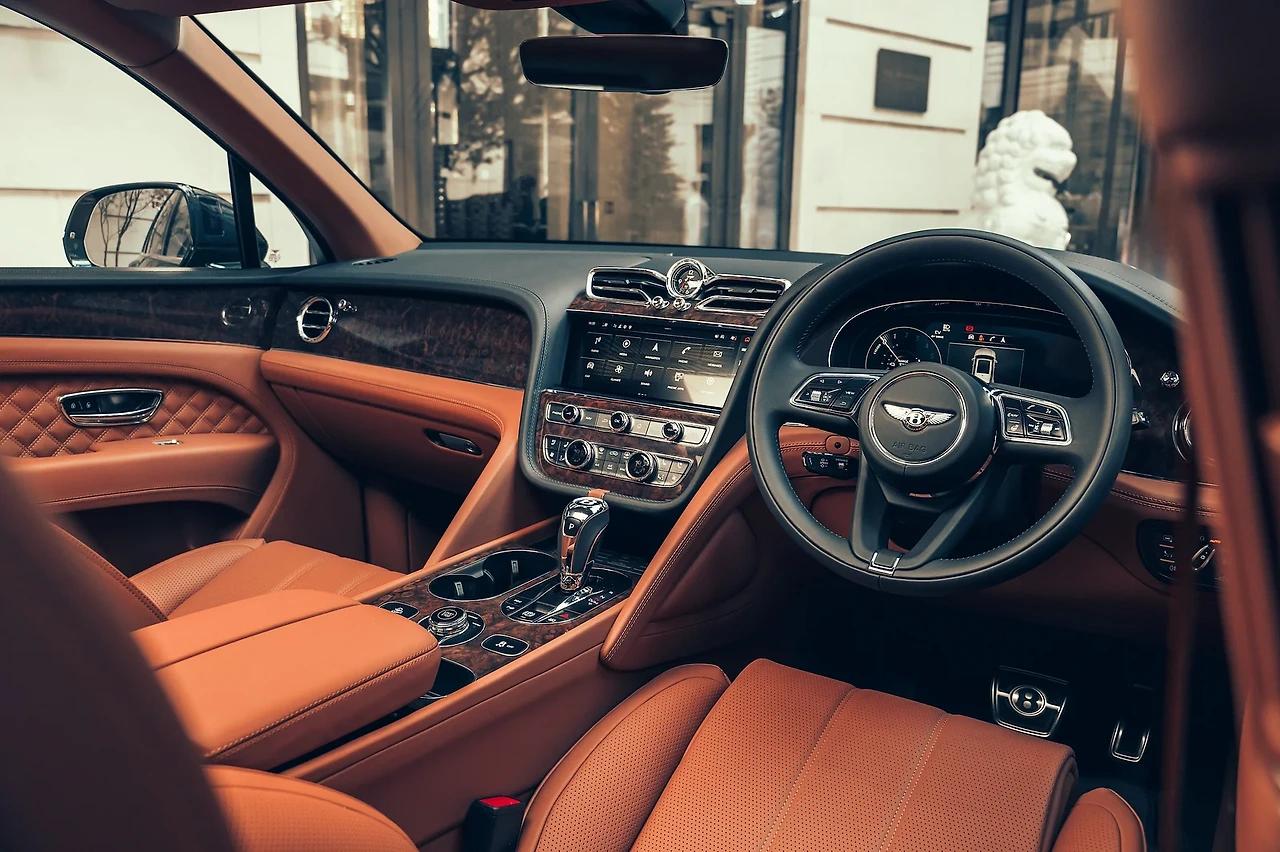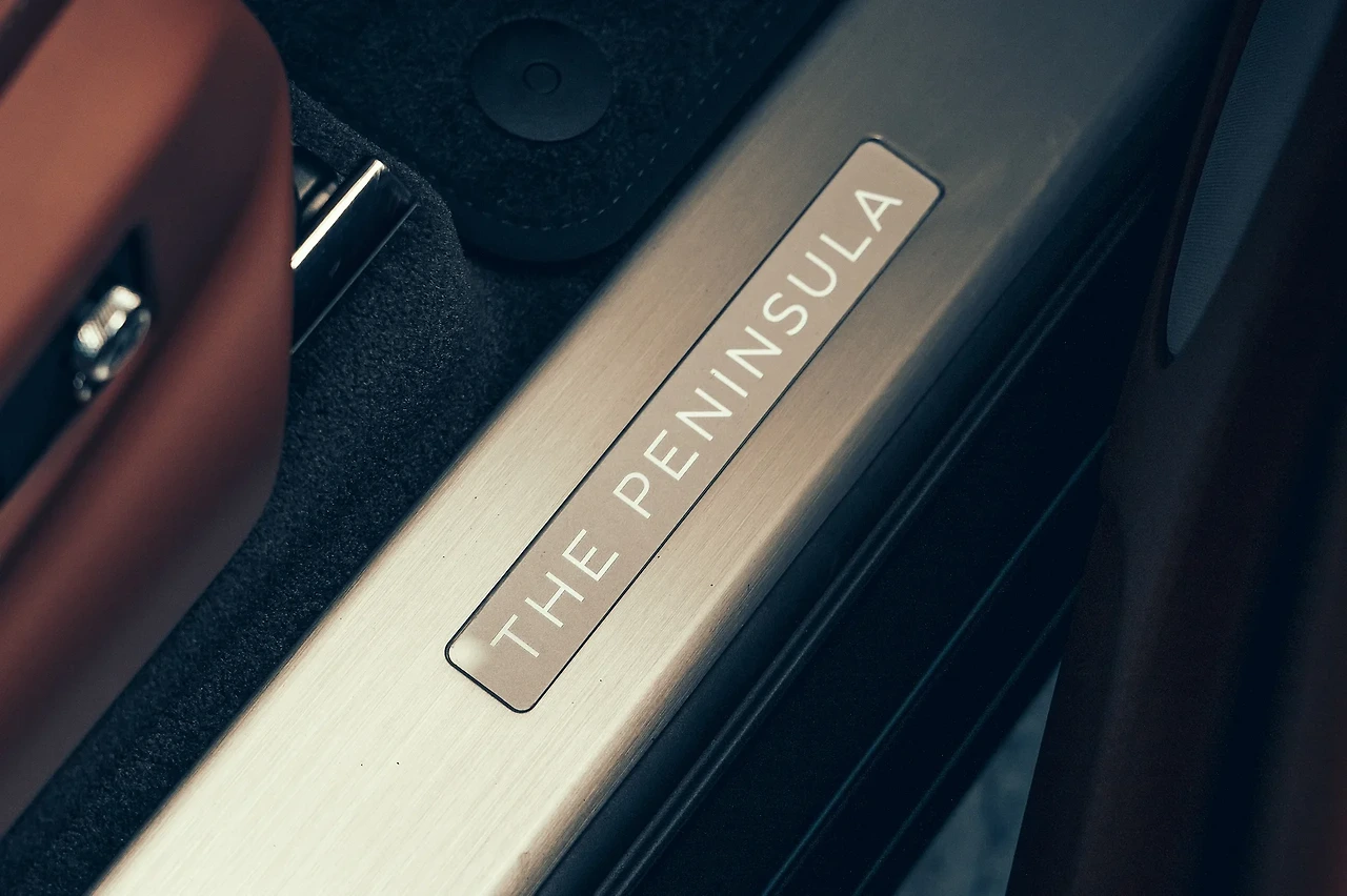 차량 내부는 편안함과 화려함이 완벽하게 조화를 이룹니다. 아주르 사양으로 제공되는 이 차량들은 새들 가죽과 벨루가 악센트의 조합으로 고급스러움을 극대화했습니다. 좌석 뒷면에는 웰니스 퀼팅이 적용되어 있고, 버 월넛 베니어는 우아한 대비를 제공합니다. 차내에는 호텔 객실에서 사용하는 티슈, 타월, 잡지를 위한 공간이 마련되어 있고, 메탈 배지로 표시되어 있습니다. 뒷좌석 승객을 위한 스크린과 목재 피크닉 테이블도 제공되며, 문턱판에 밝게 빛나는 더 페닌슐라의 글씨는 이동하는 동안에도 럭셔리한 경험을 상기시킵니다.