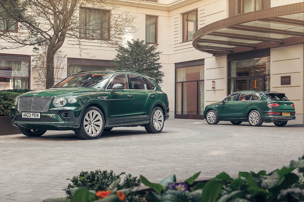 이 맞춤형 벤틀리 벤테이가는 호텔의 특별한 택시 서비스로 사용됩니다. 벤틀리의 맞춤 제작 부서인 뮬리너가 제작한 이 차량들은 더 페닌슐라 호텔의 브랜드 정체성을 반영하여 디자인되었습니다. 차량의 외관은 특유의 페닌슐라 그린으로 마감되었고, 미묘한 꿀색 코치라인으로 우아함을 더했습니다. 차량의 문에는 더 페닌슐라 런던의 엠블럼이 새겨져 있고, 웰컴 램프는 바닥에 페닌슐라 로고를 비춰 호텔의 고급스러운 이미지를 강조합니다.