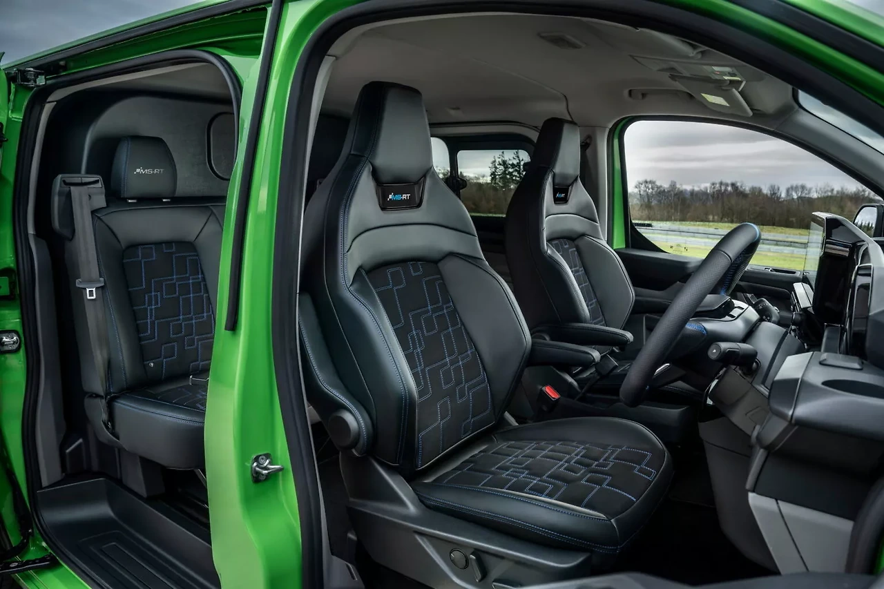 외관을 보면 가장 먼저 눈길을 끄는 것은 마치 RS 밴을 떠올리게 하는 에어로다이나믹 디자인입니다. 전면부에는 실제로 작동하지는 않지만, 크게 눈에 띄는 흡기구와 스플리터가 장착되어 있고, 허니콤 패턴의 그릴 위에는 MS-RT 엠블럼이 자리잡고 있습니다. 차체 색상과 맞춰진 펜더 확장과 사이드 스커트는 이 밴의 스포티한 멋을 더욱 부각시킵니다.