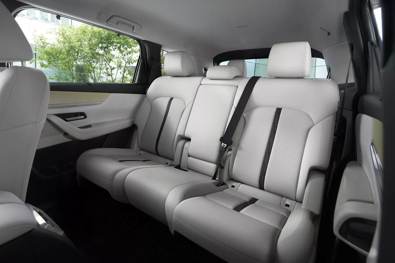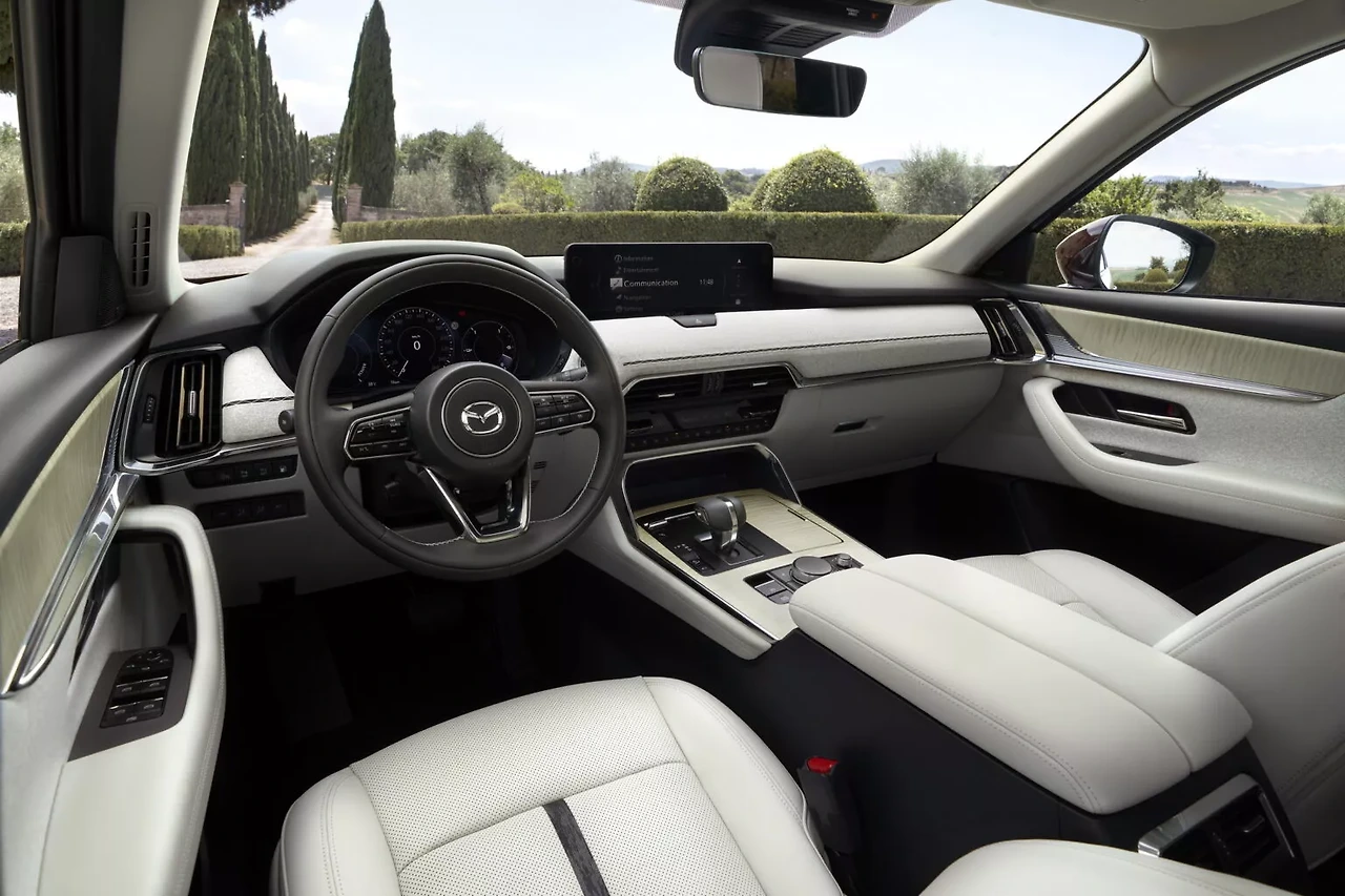 CX-80의 내부는 세 줄 좌석 구성으로 최대 7명의 승객을 수용할 수 있으며, 다양한 좌석 구성이 가능합니다. 특히 두 번째 줄에는 표준 좌석 세 개 또는 두 개의 캡틴 시트와 중앙 콘솔 또는 통로를 선택할 수 있습니다. 세 번째 줄의 두 좌석은 필요에 따라 완전히 접혀 화물 공간을 확장할 수 있습니다. 대시보드는 최신 인포테인먼트 디스플레이와 프리미엄 재질로 마감되어 있으며, Alexa 음성 제어와 하이브리드 내비게이션 시스템 등 최신 기술이 장착되어 있습니다.