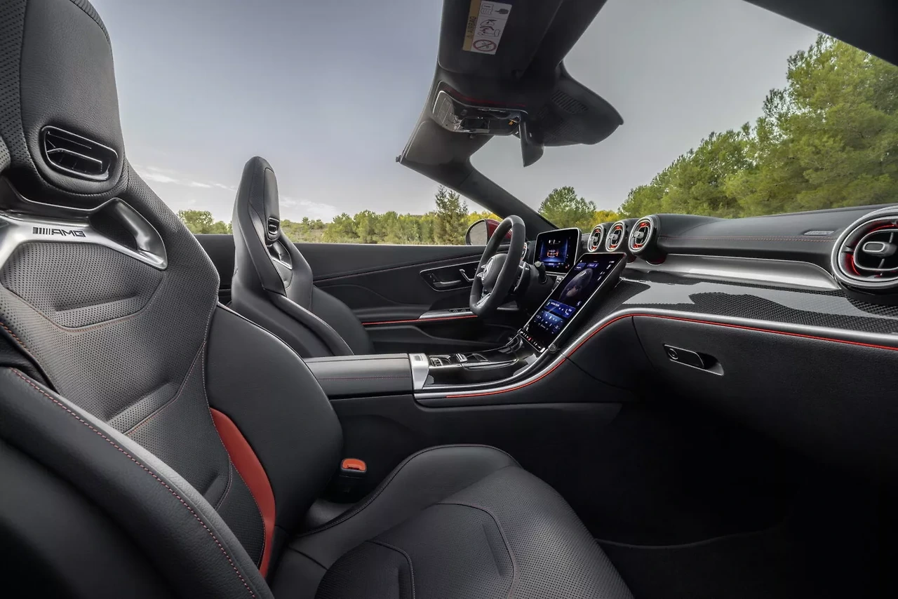 차량 내부는 12.3인치 디지털 계기판과 11.9인치 인포테인먼트 시스템이 장착되어 있습니다. 오픈 상태에서 빛 반사를 줄이는 기능도 포함되어 있습니다. 천장은 접는데 갈리는 시간은 20초가 소요되며, 최대 60 km/h 속도로 운전하면서도 조작할 수 있습니다.