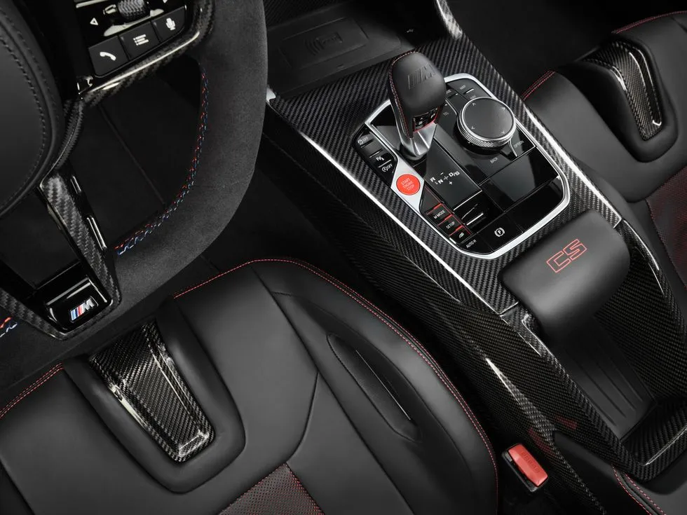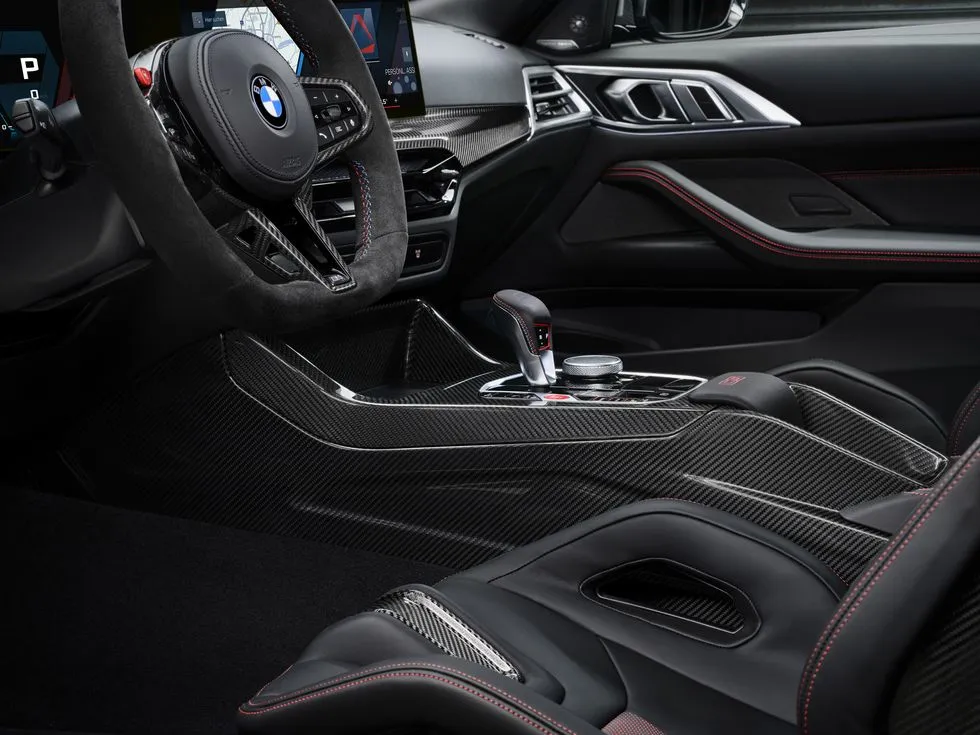 M4 CS는 기존 M4 모델들과 확연히 구분되는 외관을 갖고 있습니다. 노출된 탄소섬유 채널이 있는 후드와 루프, 그리고 에어로다이내믹 기능을 강화한 전면 스플리터 및 리어 스포일러가 특징입니다. 전면 그릴은 테두리 없이 스포티한 레드 트림과 조화를 이루며, 헤드라이트는 기존의 흰색 대신 노란색 조명 요소를 사용합니다.