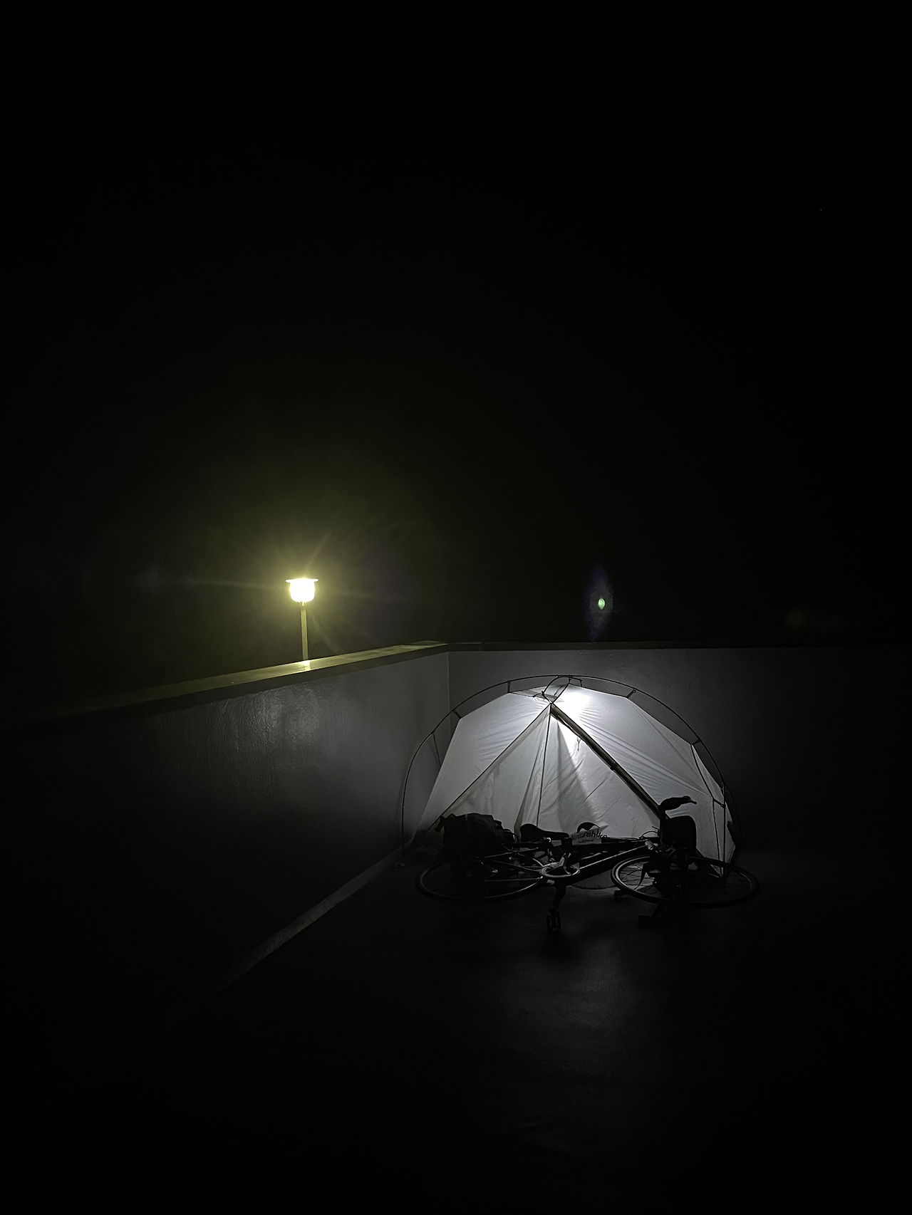 경치에 넋이 나가있던 동안 해는 정말 눈 깜짝할 사이에 수평선 너머로 자취를 감추었고, 곧 어둠이 마중을 나올 것이기에 결국 나는 이곳에서 캠핑을 하기로 마음을 먹었다. 1층짜리 건물의 전망대 옥상으로 걸어 올라갔다. ‘민폐이긴 하지만 해도 졌는데, 이제 전망대에 올라 올 사람도 없겠지.’라고 생각하며 옥상에서 텐트를 폈다. 코호네의 집 현관에는 ‘시설 주위에서 X월 XX일 곰이 목격됨’이라는 무시무시한 안내문이 붙어 있었다. 주차장 쪽에 텐트를 치기엔 사방이 열려 있어 너무 위험한 것 같았다. 이곳은 반경 10km 내로 아무것도 없는, 정말 자연의 한복판이었다. 그래서 곰이 옥상에는 올라오진 않지 않을까, 하고 옥상을 선택한 것이었다.