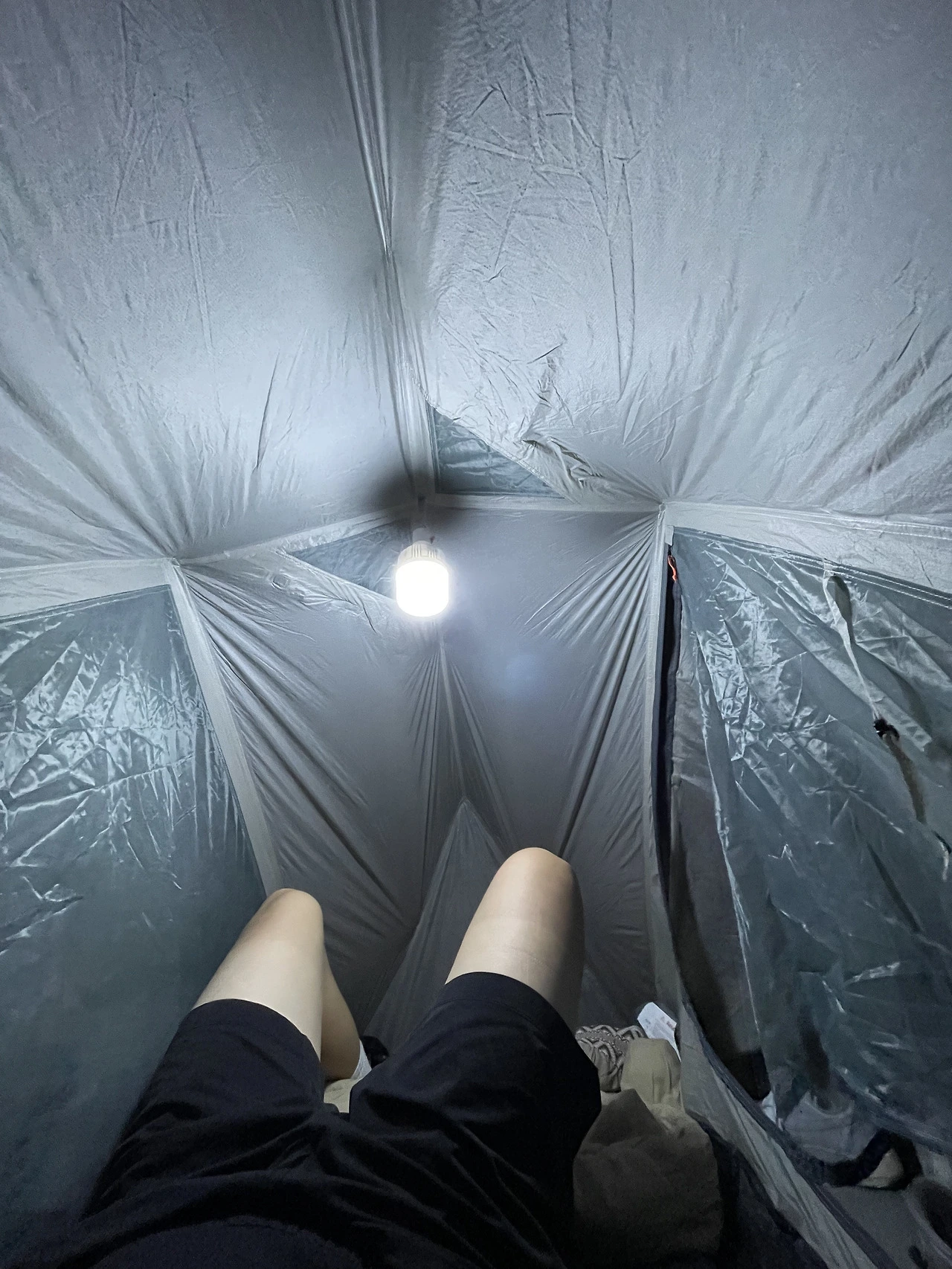 그러다가 겨우 잠이 들었던 것 같다. 신기하게도 밤 12시가 되자 바람이 귀신같이 멈추고 주변이 고요해졌다. 그때부터 또 다른 문제가 있었으니 그건 바로… 추위였다. 따뜻하다는 패브릭 침낭을 골랐지만, 경량은 결국 경량이었다. 입고 있던 옷은 가져온 히트텍 하나와 반바지가 전부였다. 텐트 안에는 냉기가 서렸다. 온몸을 벌벌 떨면서 간신히 휴대폰으로 기온을 확인하니 12도였다. 그제야 내가 지금 러시아 위도와 같은 위도에 있구나, 나는 러시아에서 이런 텐트에서 지금 노숙을 하고 있는 것과 마찬가지구나,라는 것을 깨달았다. 군대에서 하던 철야 훈련 때의 기억이 떠올랐다. 전역을 얼마 전에 했는데 훈련을 스스로 하고 있는 듯한 내 꼴에 웃음이 나왔다.