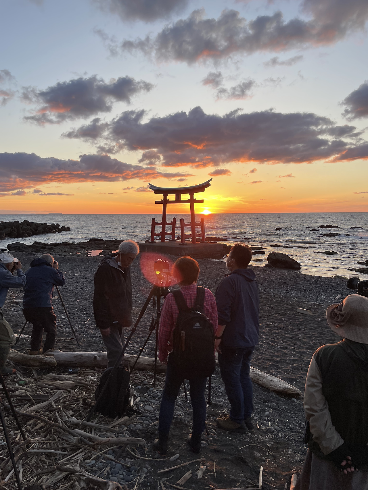 호텔에 체크인하기 전에 근처에 있던 쇼산베츠무라라는 유명한 바다 위의 토리이를 보러 갔다. 석양 풍경이 아름답다고 한다. 또 운이 좋게도 석양이 지기 직전에 맞춰서 도착했다. 이미 토리이 근처에는 여러 일본 사람들이 대포카메라 등을 삼각대에 설치하고 일몰을 기다리고 있었는데, 대체로 나이가 꽤 많은 어르신들이라는 점이 신기했다. 저렇게 나이 많은 어르신들이 직업이 사진가는 아니실 테니까. 어제 별을 찍으러 왔던 분도 그렇고, 일본은 다들 사진이라는 취미에 진심인 사람들이 많아 보였다.