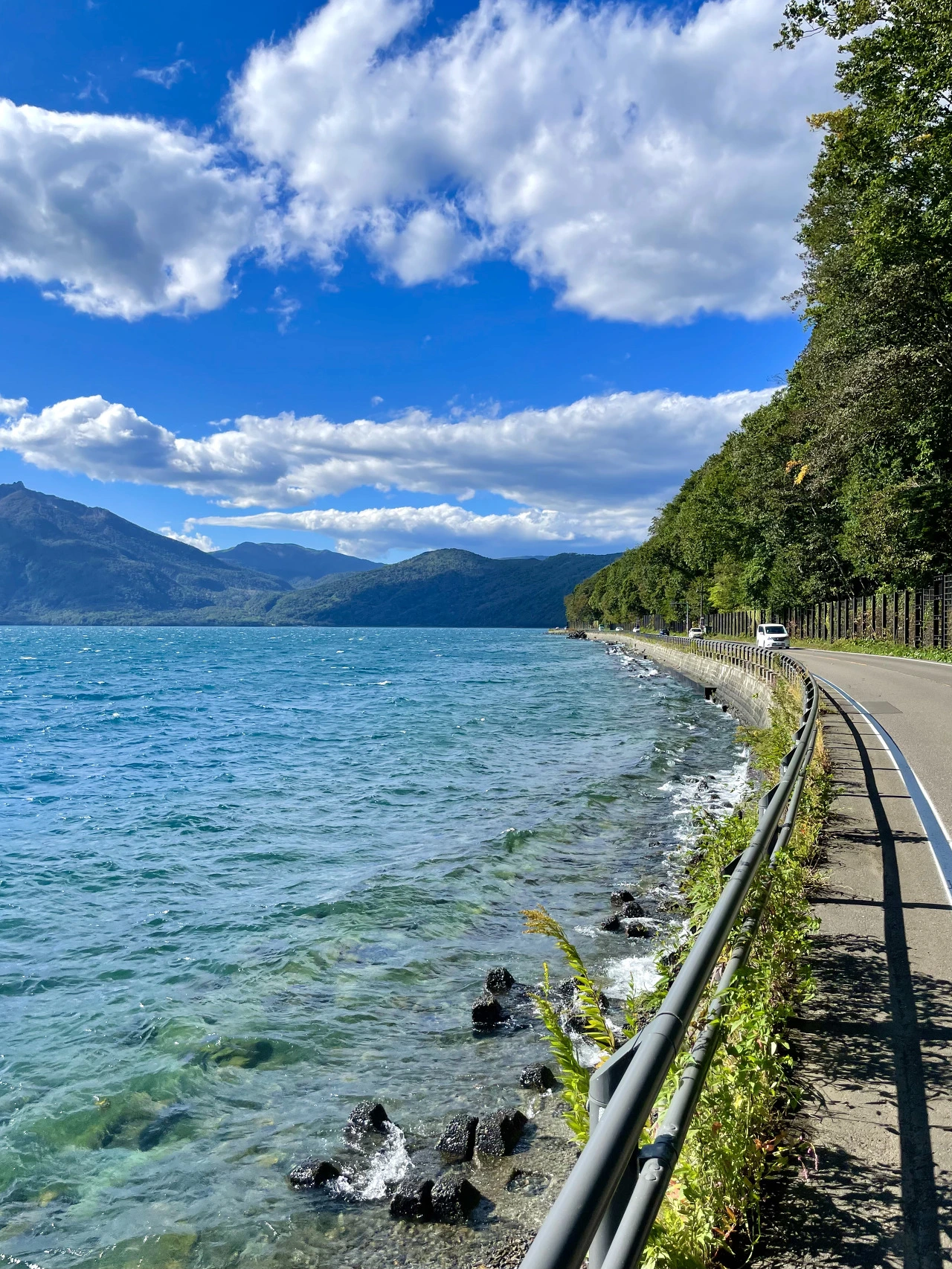 차를 비롯해 나를 쌩쌩 제치고 호수를 향해 가는 듯한 바이크들이 많이 보였다. 드디어 오르막의 끝을 알리는 ‘시코쓰호에 어서 오세요.’라는 일본어 간판이 보였다. 이제 내리막만 내려가면 호수가 보이겠지? 10여 분 정도가 흘렀을까, 옆을 돌아보니 울창한 숲의 나무 사이로 조용하고 파란 거인이 산 위에 드러누워 있었다.