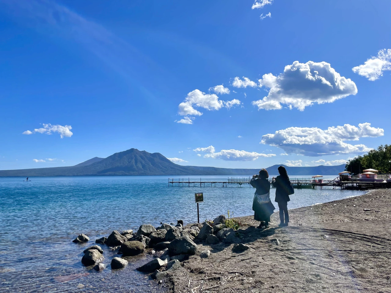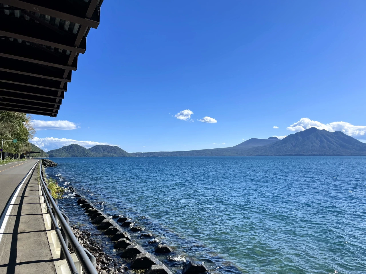 내리막을 내려와 호수 앞의 휴게소에 도착했다. 하늘보다 호수가 더 새파랬다. 시코쓰호는 호수라기보다 마치 산으로 둘러싸인 바다 같았다. 실제로 시코쓰호는 백두산 천지의 10배 크기라고 하는데, 이런 높은 산 위에 이렇게 많은 물이 어디서 왔는지도 신기했다. 삼각대를 꺼내서 아름다운 경치를 배경으로 연신 사진을 찍었다. 관광객이 크게 붐비지는 않았다. 바이크를 타고 온 라이더들, 혹은 자차를 끌고 온 일본인들이 가끔 차에 내려서 호수를 구경하는 모습이 보일 뿐이었다.