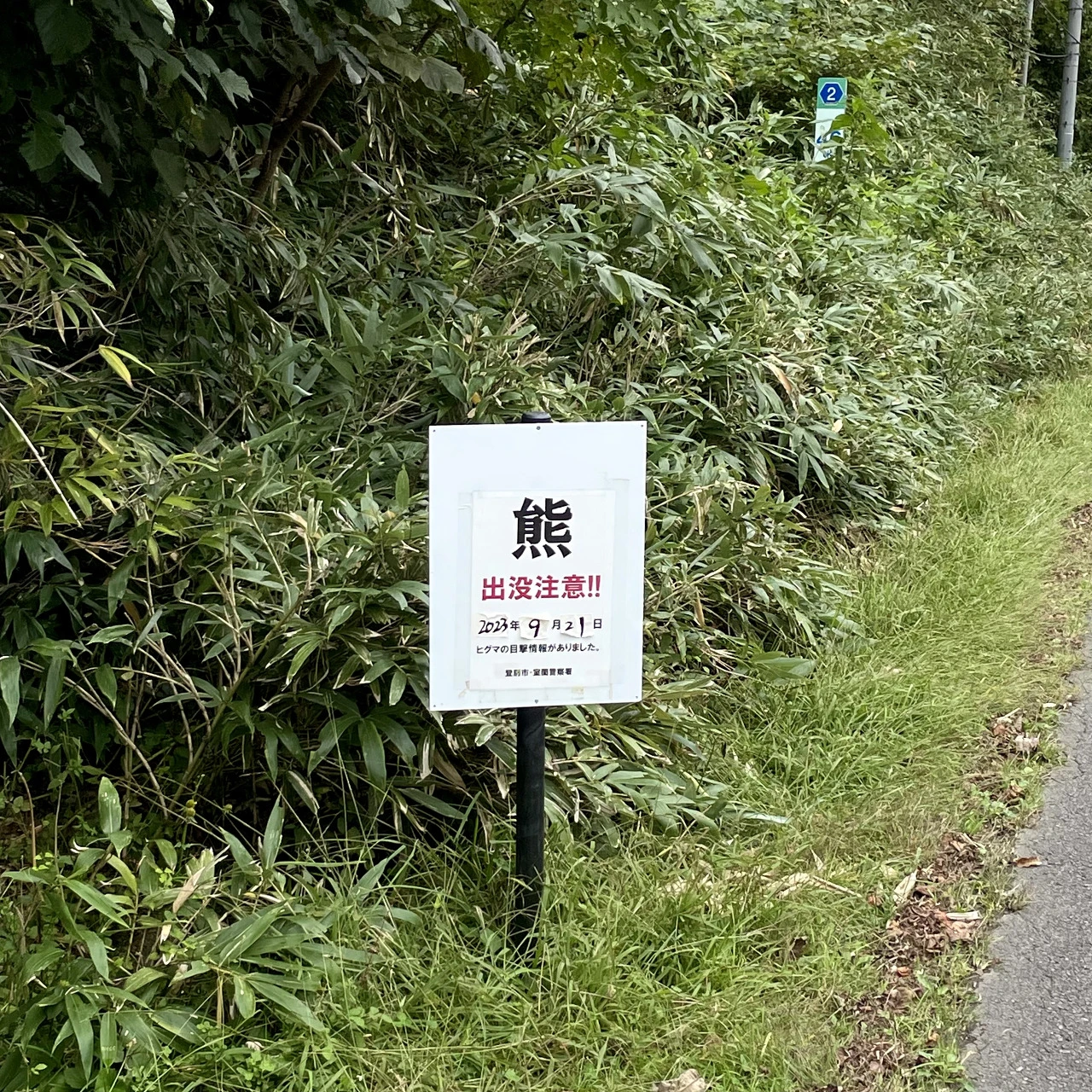 확실히 현도는 국도에 비해 통행량이 매우 적어서 자유롭게 라이딩을 하기에 좋았다. 5분에 한 대 정도 차량이 지나다녔다. 가던 도중 곰 주의문 표지판이 보였다. 오늘이 며칠이지? 9월 30일. 그리고 표지판에 있는 목격 날짜는 9월 21일. 순간 간담이 서늘해졌다. 이렇게 사진 찍고 한가하게 시간을 지체를 할 게 아니었다. 차량 하나 없는 현도의 정적은, 나 홀로 넓은 도로를 신나게 라이딩할 수 있도록 깔아 둔 배경음악이 아니었던 것이다.