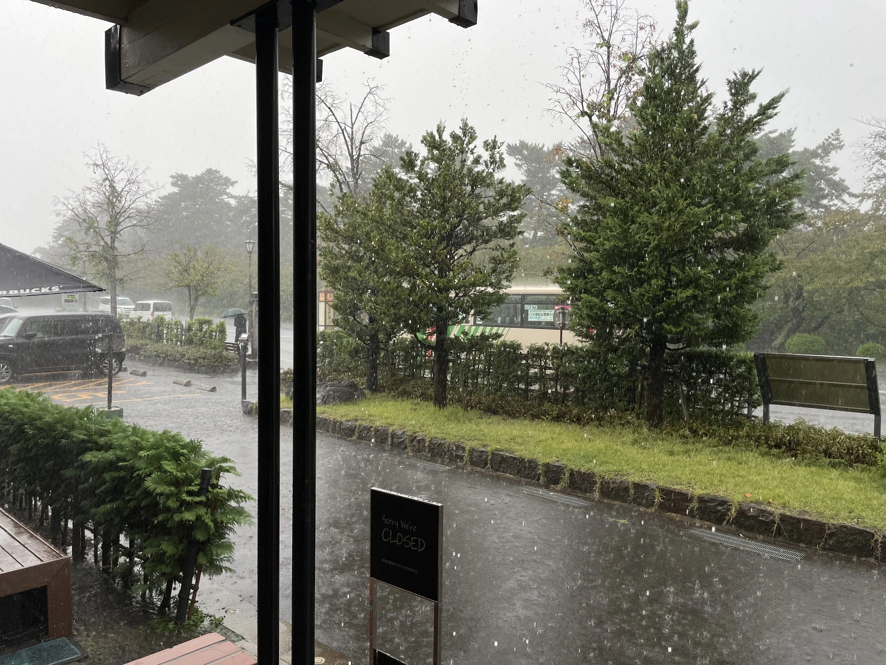 미닫이창 너머로 건물 뒤뜰의 작고 푸른 일본식 정원이 보이는, 고즈넉한 분위기가 마음에 들었다. 긴 책상 자리에 착석한 후, 주문한 애플파이를 숟가락으로 한 입 떠먹고는 가방 대신 대롱대롱 비닐봉지에 들고 온 태블릿을 꺼냈다. 홋카이도에서 자전거를 타며 찍었던 사진들을 휴대폰에서 태블릿으로 옮겨가며 여행기를 정리했다. 글을 쓰다가 잠시 목이 뻐근해 고개를 돌리자, 입구로 들어오는 새로운 손님들이 쓰고 온 우산을 탈탈 털어대고 있었다. 아까보다 비가 꽤 오는 건가? 정문으로 살짝 나가보자 깜짝 놀랐다. 태풍이라도 온 것처럼 엄청난 폭우가 도로 아스팔트 위를 두들기고 퍼부어 내리고 있었다.